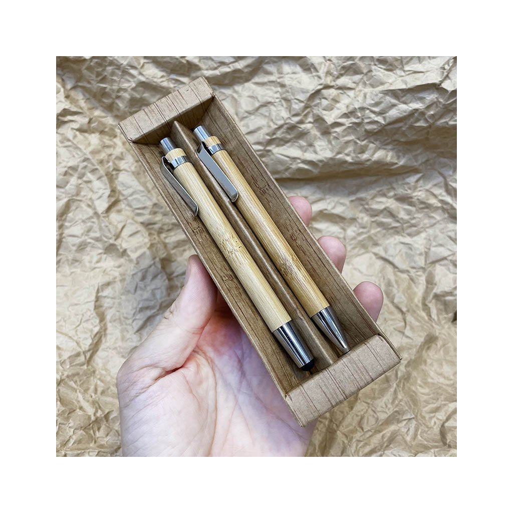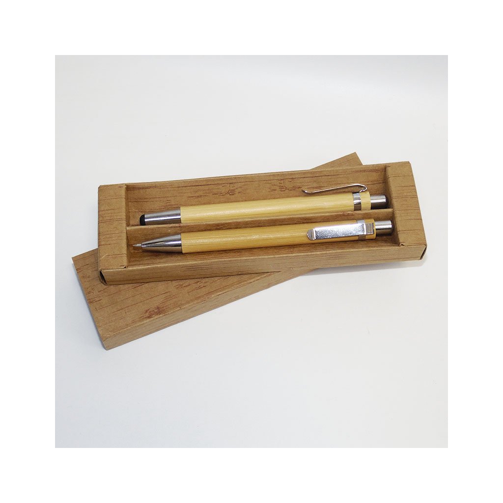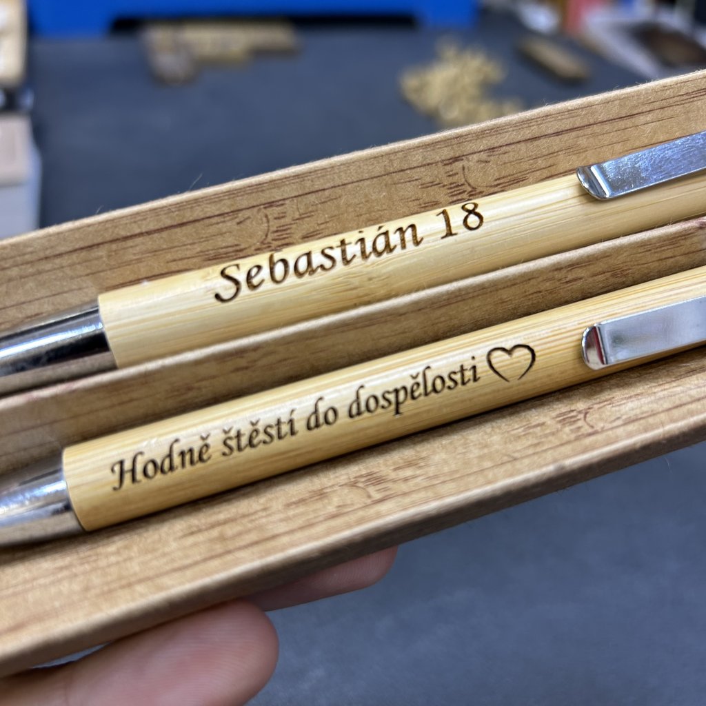 Stylová bambusová sada s propiskou a mikrotužkou v dárkovém balení. Gravírujeme jakýkoliv text – jméno, motto nebo věnování. Ideální jako osobní dárek.