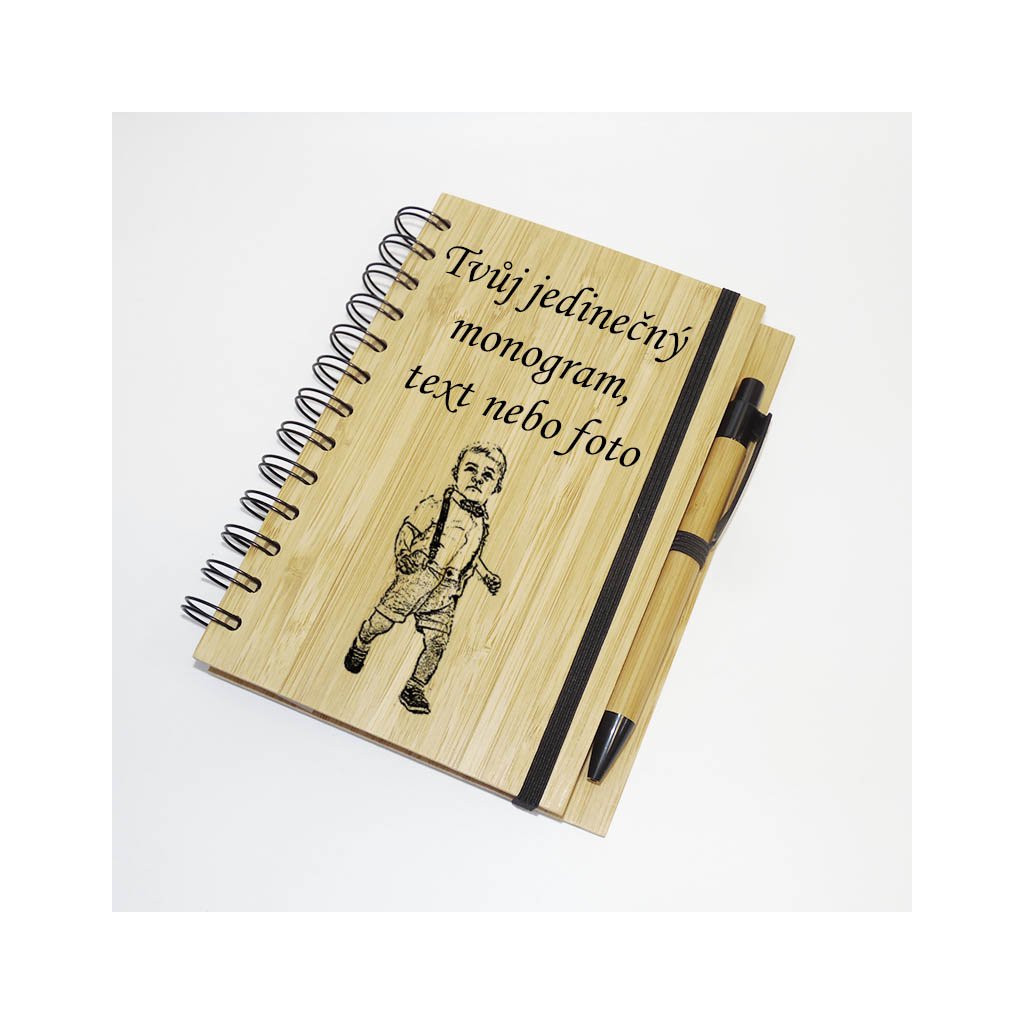 Dřevěný zápisník A5 a bambusová propiska s vaším textem nebo fotkou