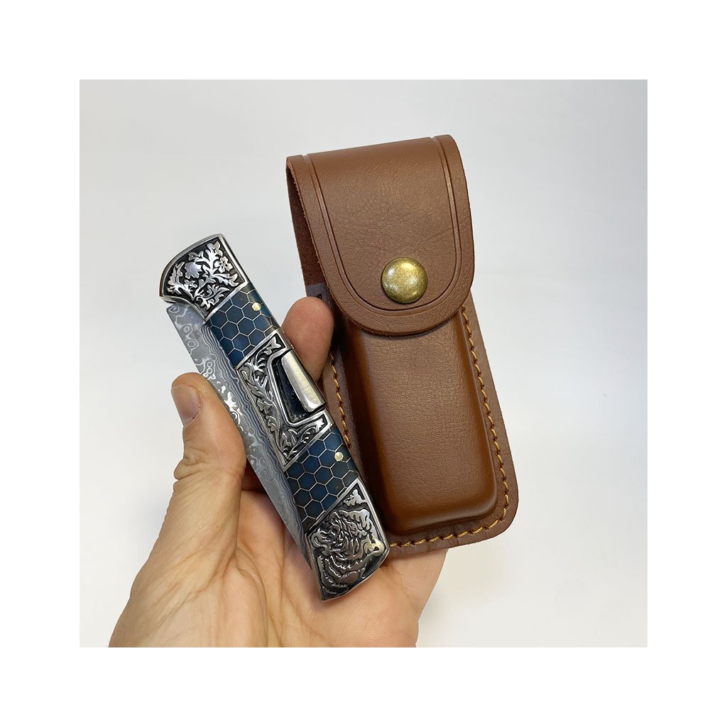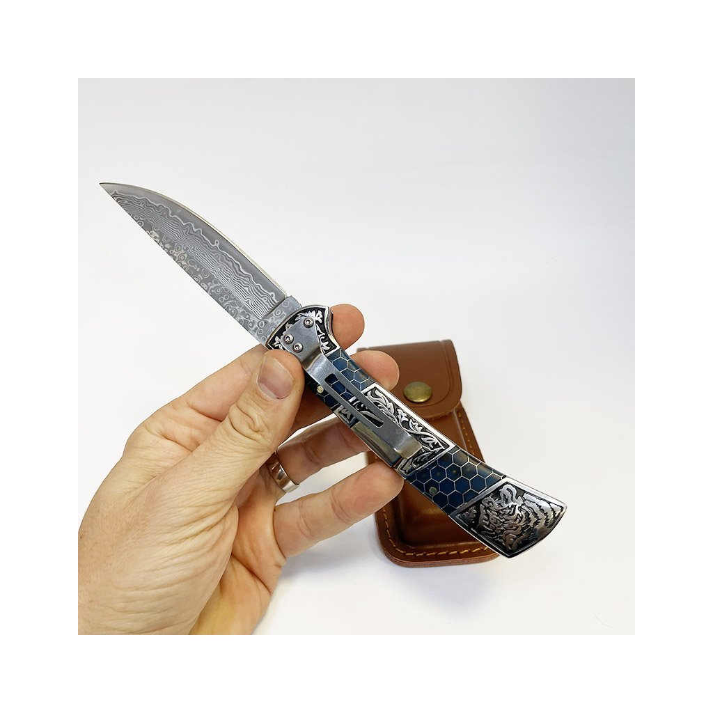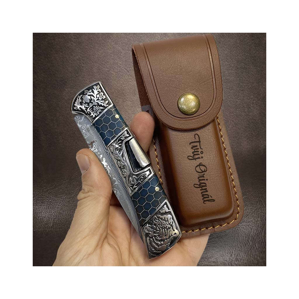 Damaškový exkluzivní prémiový vyklápěcí nůž s vlastním textem, včetně koženého pouzdra + prémiové dárkové balení BE Original