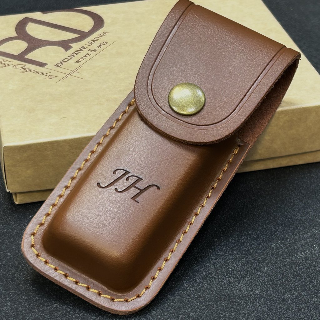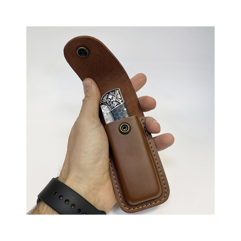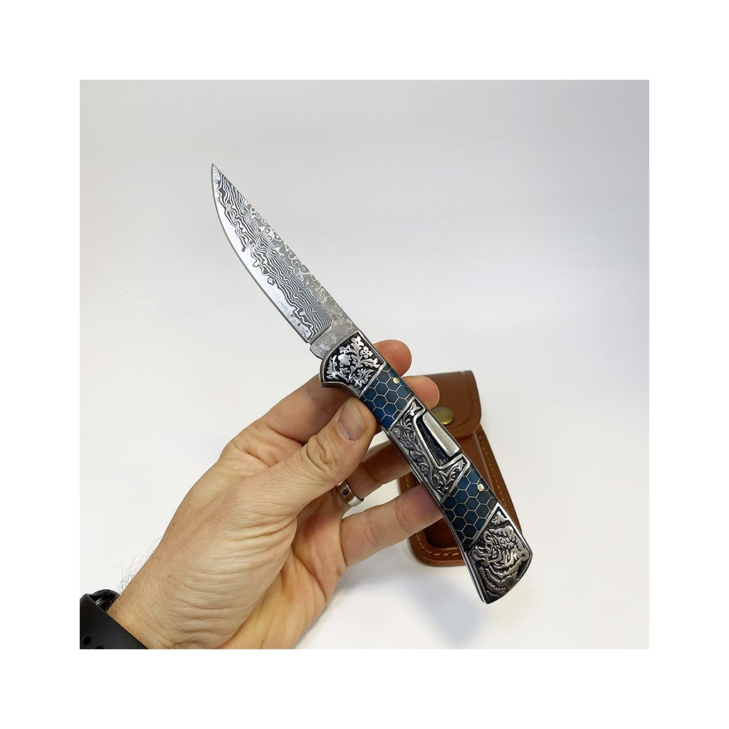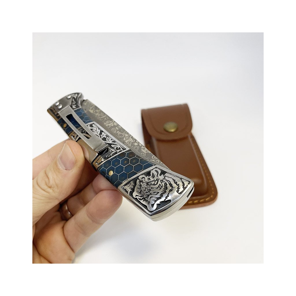 Damaškový exkluzivní prémiový vyklápěcí nůž s vlastním textem, včetně koženého pouzdra + prémiové dárkové balení BE Original