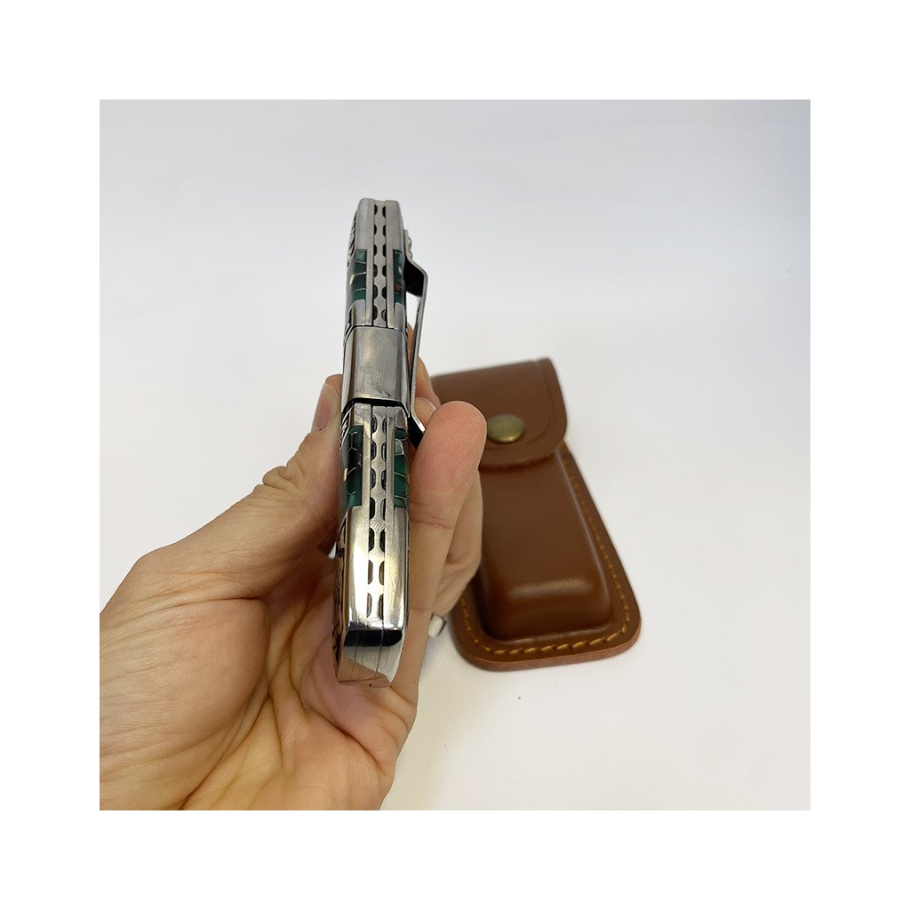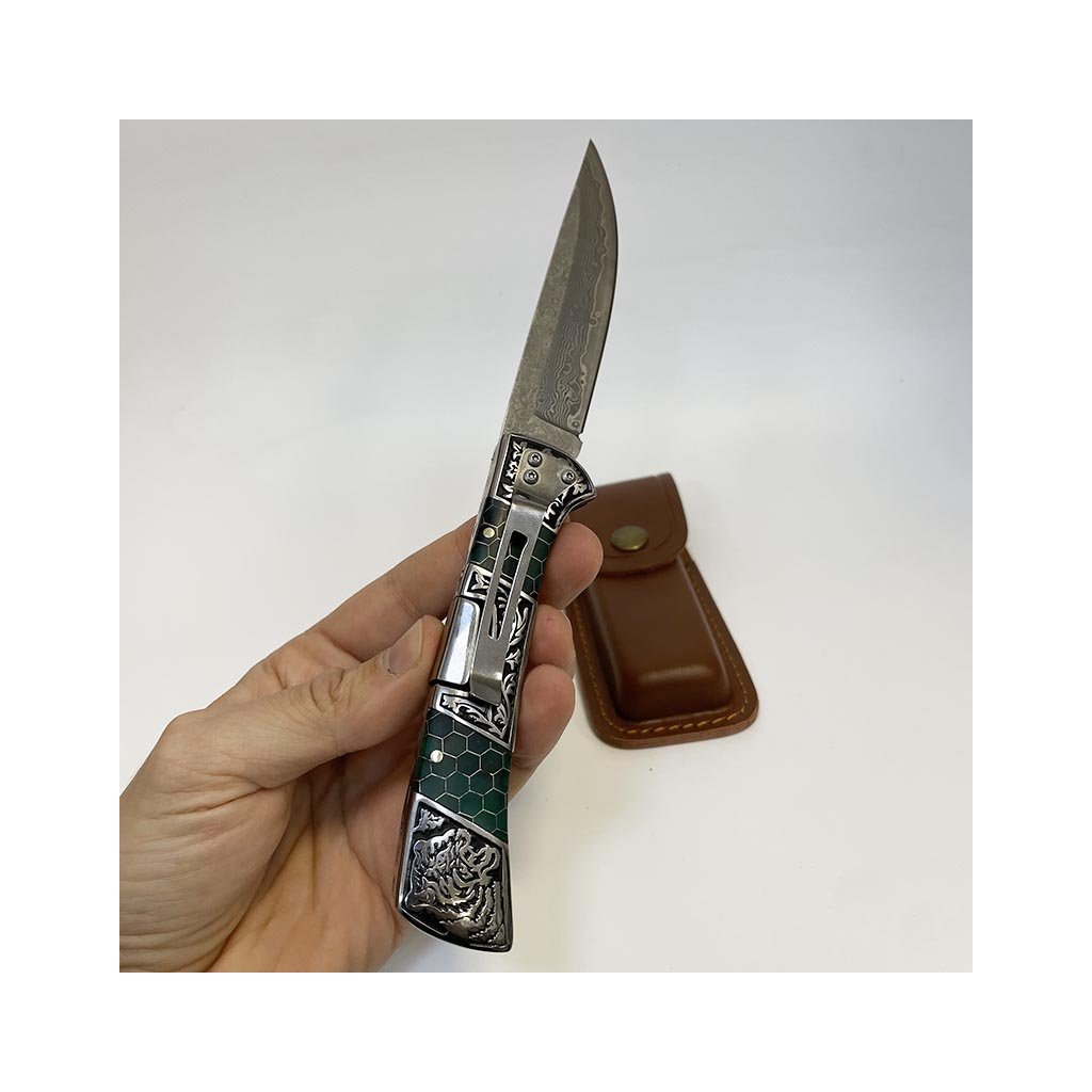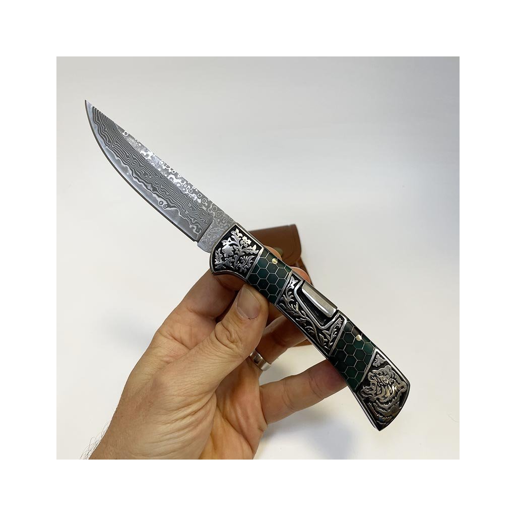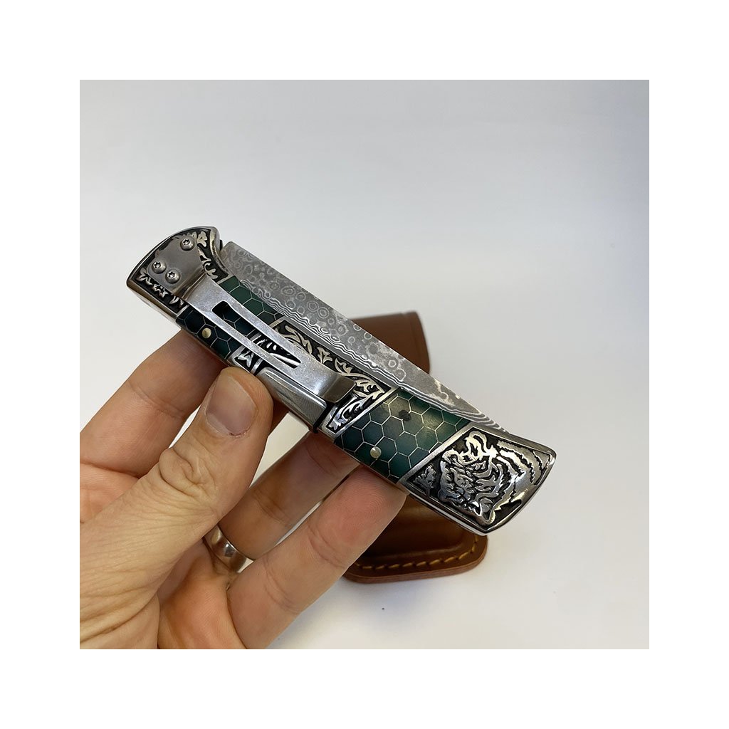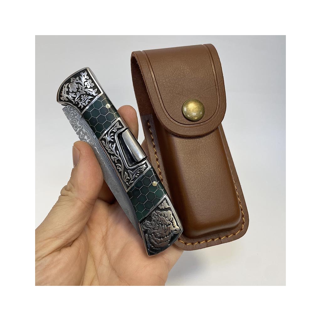 Damaškový luxusní vyklápěcí nůž v zeleném odstínu včetně koženého pouzdra s vaším jedinečným textem, famózní originál