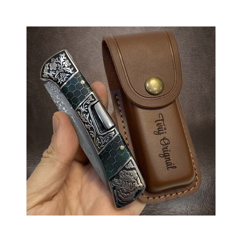 Damaškový zelený luxusní prémiový vyklápěcí nůž s vlastním textem, včetně koženého pouzdra + prémiové dárkové balení BE Original