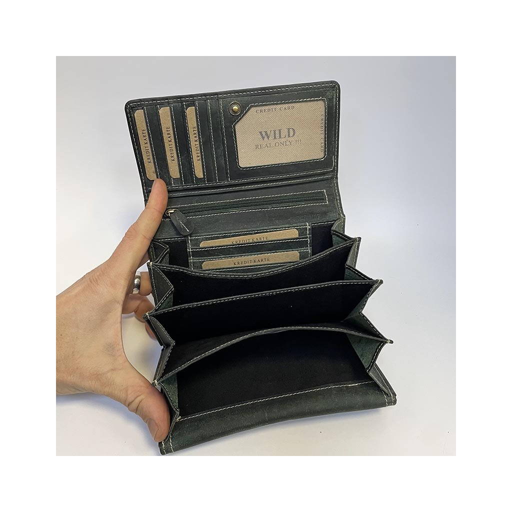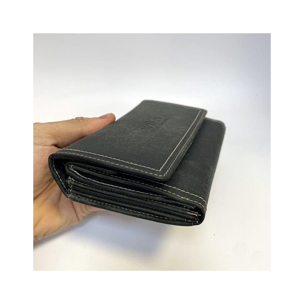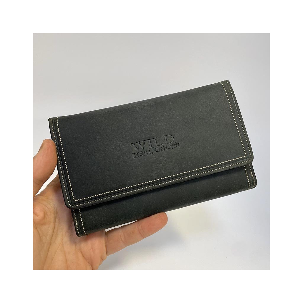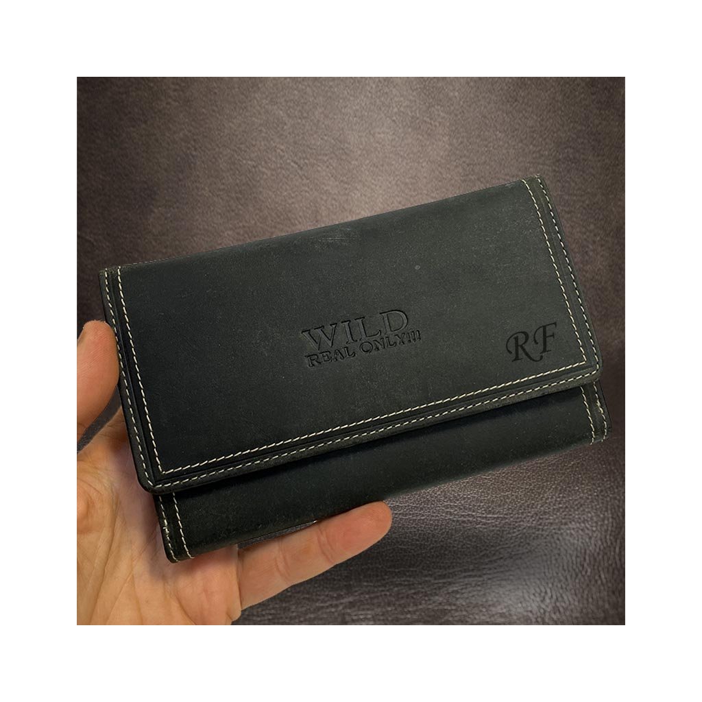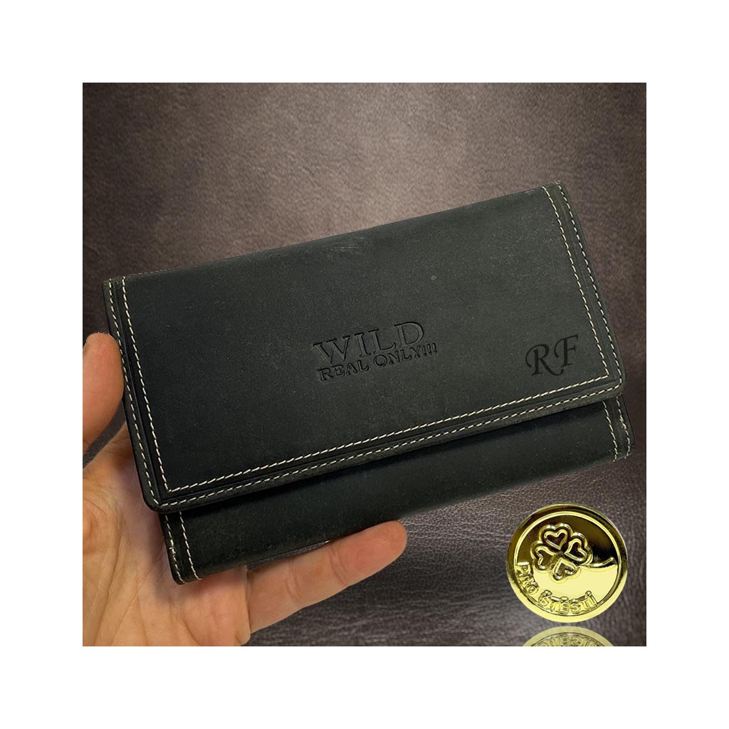 Dámská černá kožená peněženka WILD LEATHER s monogramem + Akce - zlatá mince Pro štěstí ZDARMA