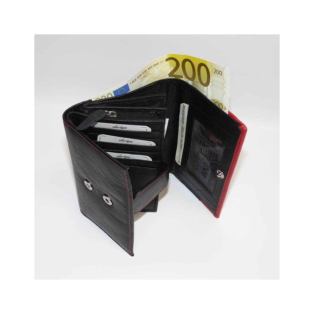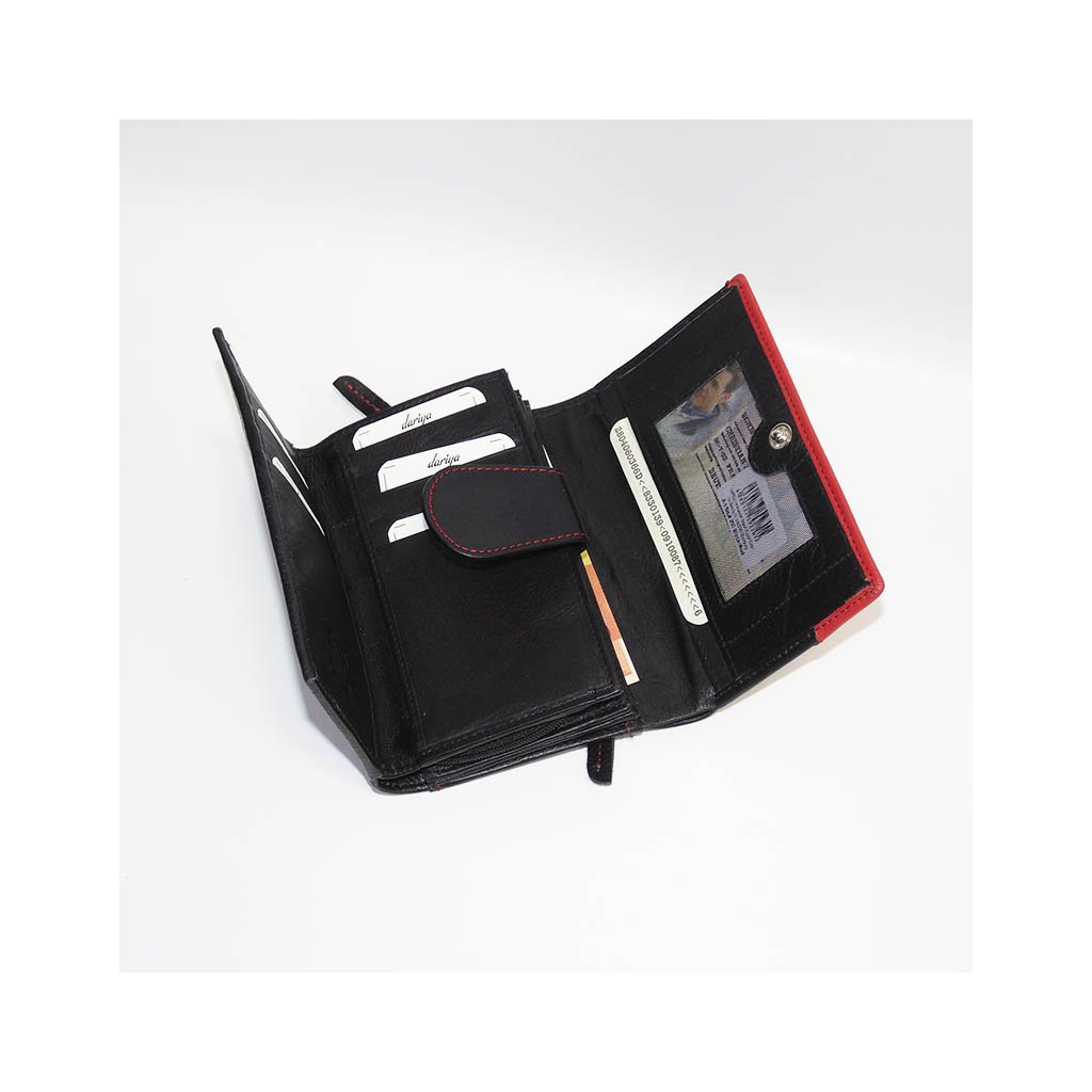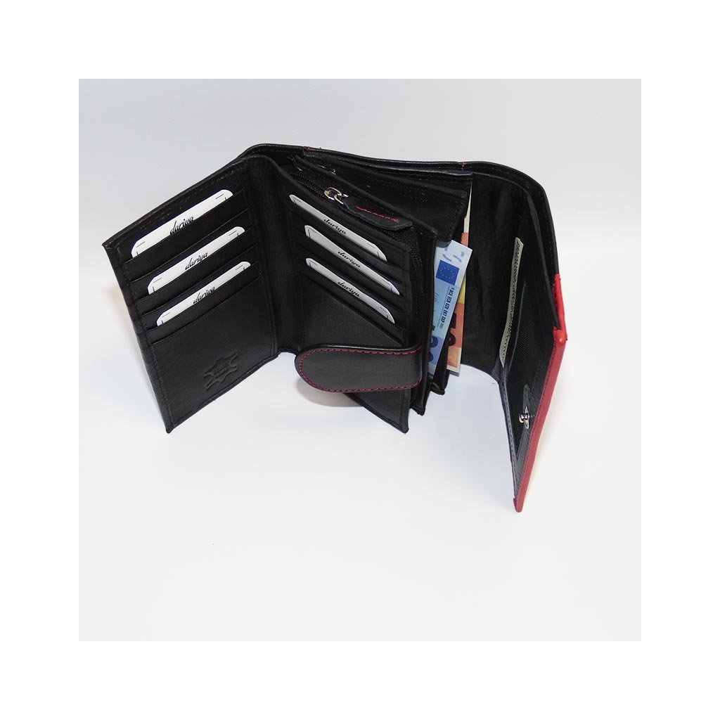 Elegantní dámská peněženka z pravé kůže v kombinaci černé a sytě červené barvy zaujme na první pohled. Precizní prošití červenou nití podtrhuje její stylový design.