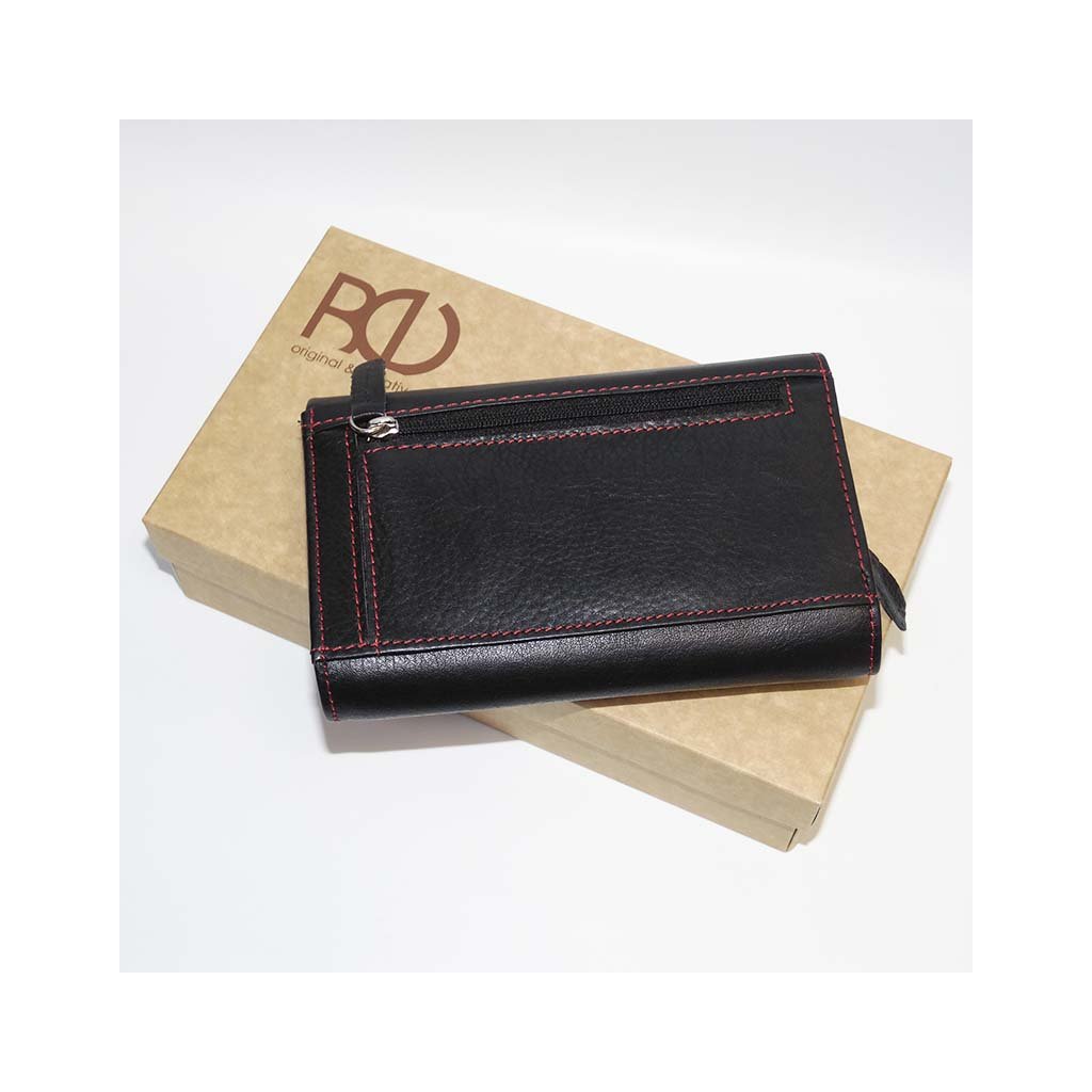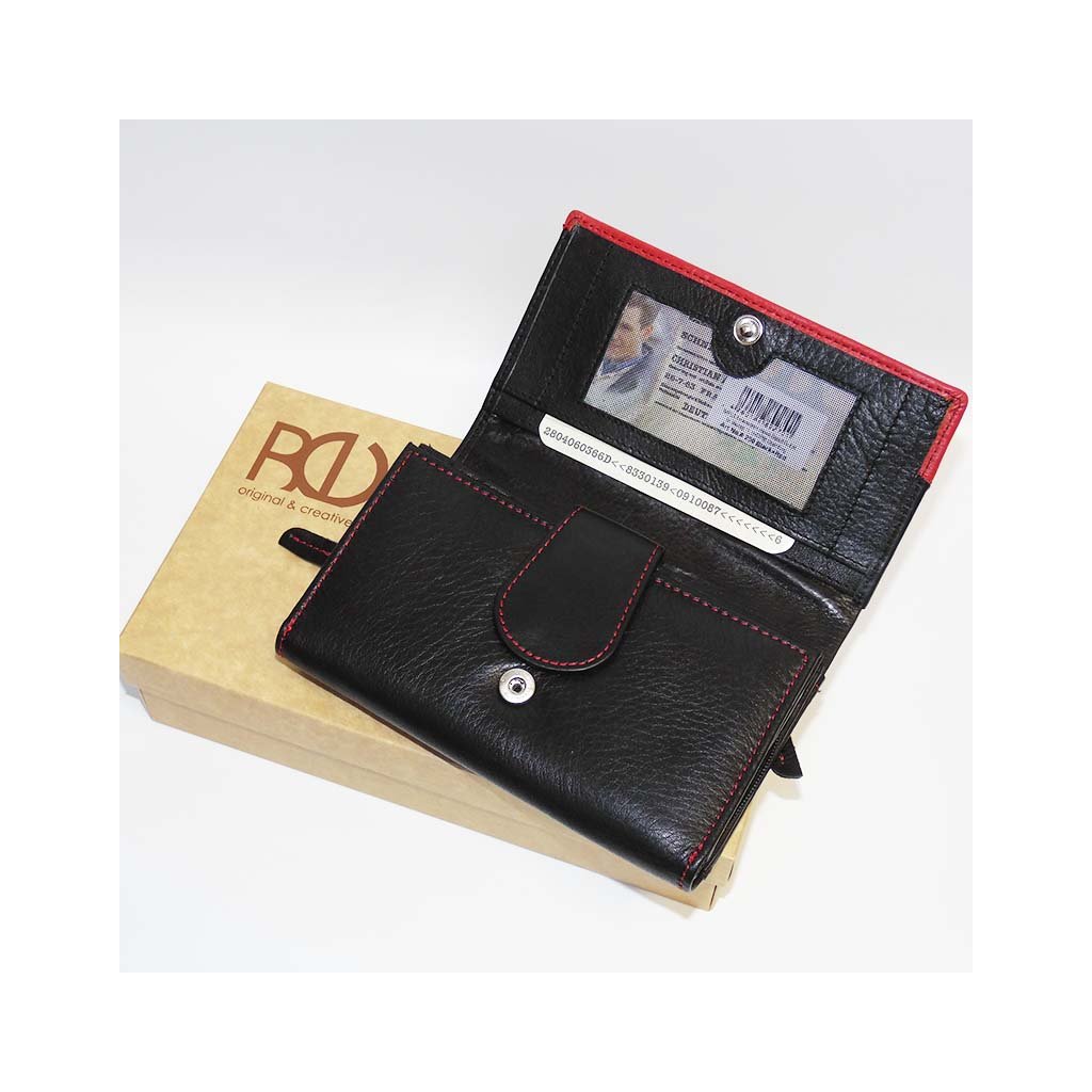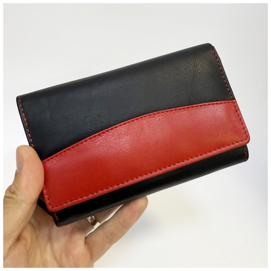 Elegantní dámská peněženka z pravé kůže v kombinaci černé a sytě červené barvy zaujme na první pohled. Precizní prošití červenou nití podtrhuje její stylový design.