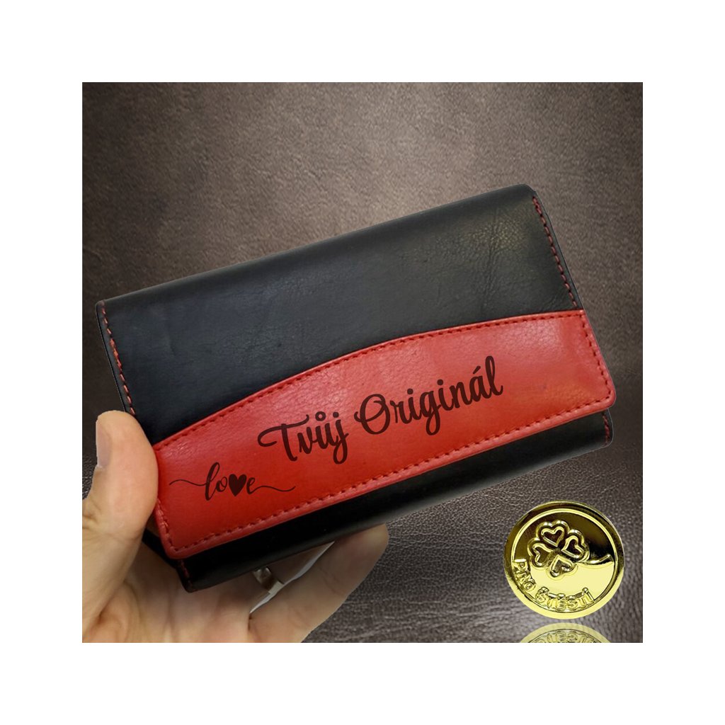 Dámská černo červená kožená peněženka BEORIGINAL s monogramem a vlastním textem + Akce - zlatá mince Pro štěstí ZDARMA