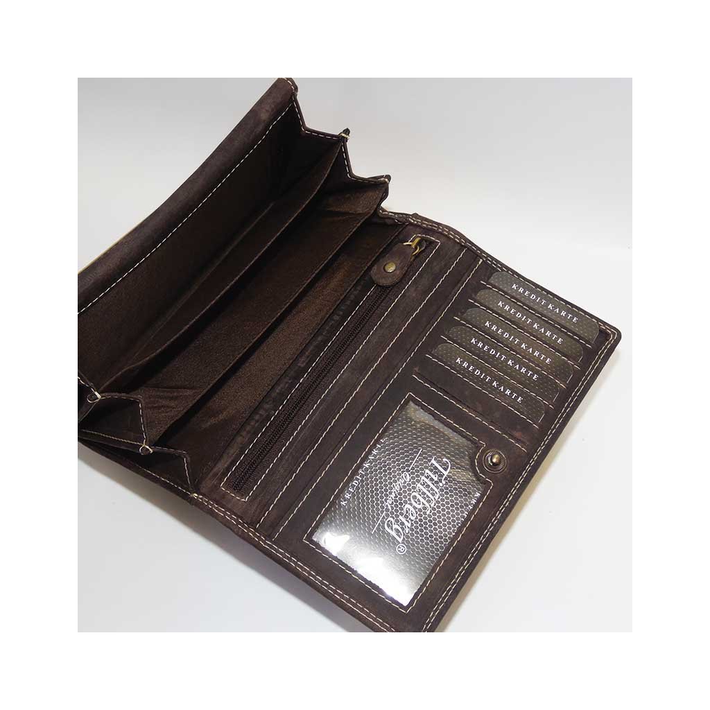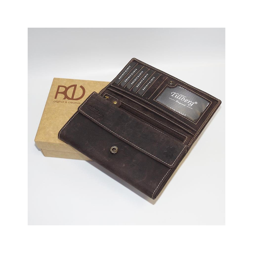 Dámská hnědá peněženka TILLBERG z kvalitní broušené pravé kůže v sobě spojuje eleganci, praktičnost a originalitu. Je střední velikosti, ideální pro každodenní nošení, a navíc připravená nést váš vlastní příběh – monogram, text či obrázek, který z ní udělá naprosto jedinečný kousek.