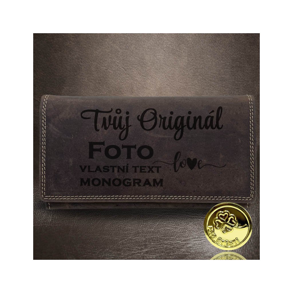 Dámská hnědá kožená peněženka TILLBERG s monogramem a vlastním textem + Akce - zlatá mince Pro štěstí ZDARMA