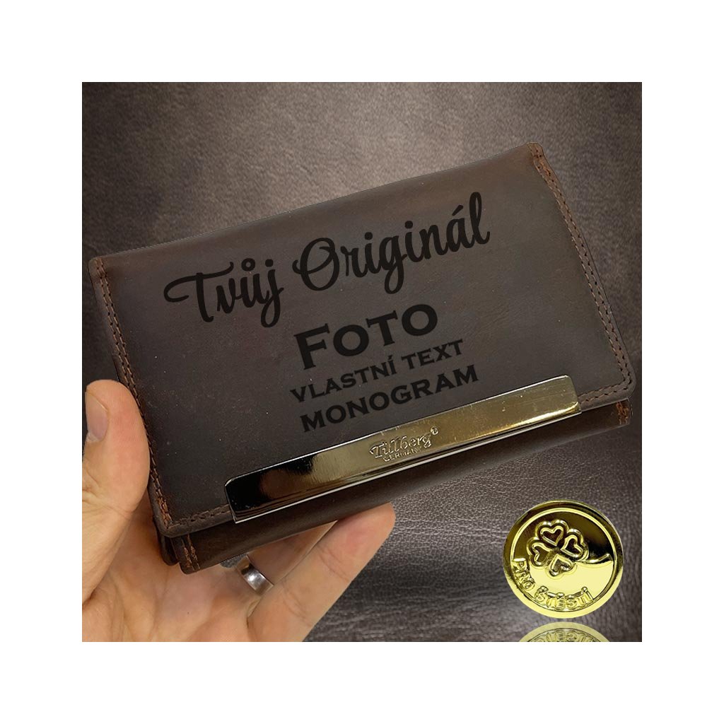 Dámská prémiová tmavě hnědá kožená peněženka TILLBERG LEATHER RFID s monogramem, vlastním textem nebo fotkou + Akce - zlatá mince Pro štěstí ZDARMA