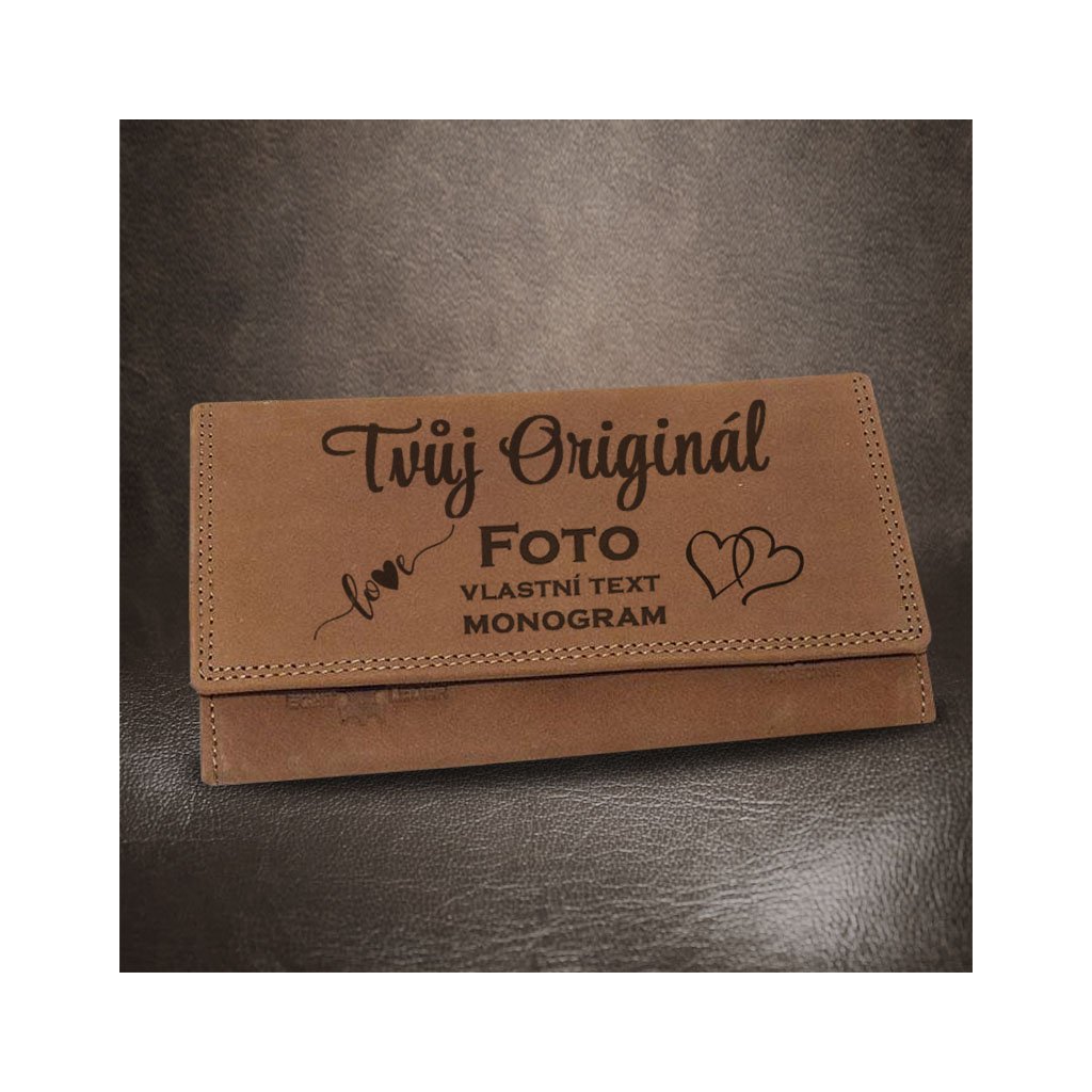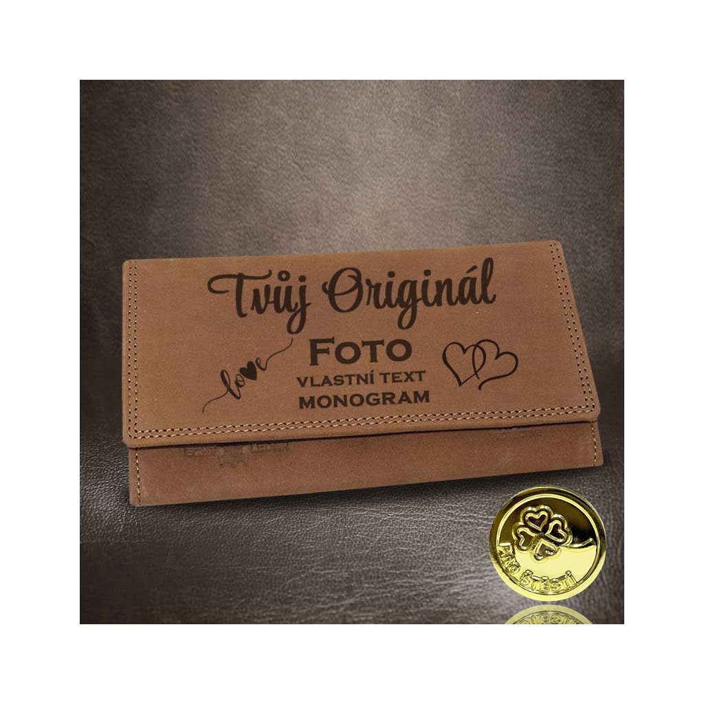 Dámská SLIM hnědá kožená peněženka BEORIGINAL s monogramem, vlastním textem nebo fotkou + Akce - zlatá mince Pro štěstí ZDARMA