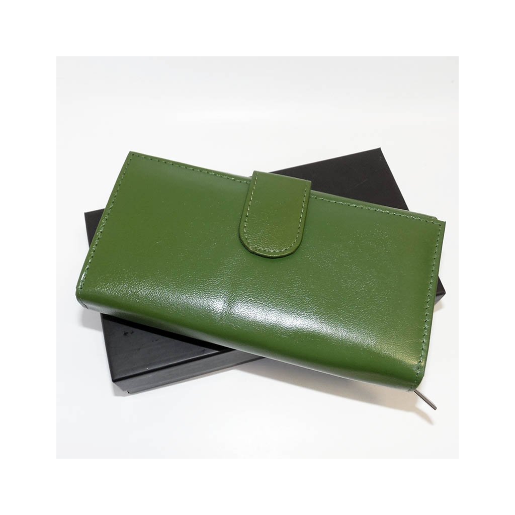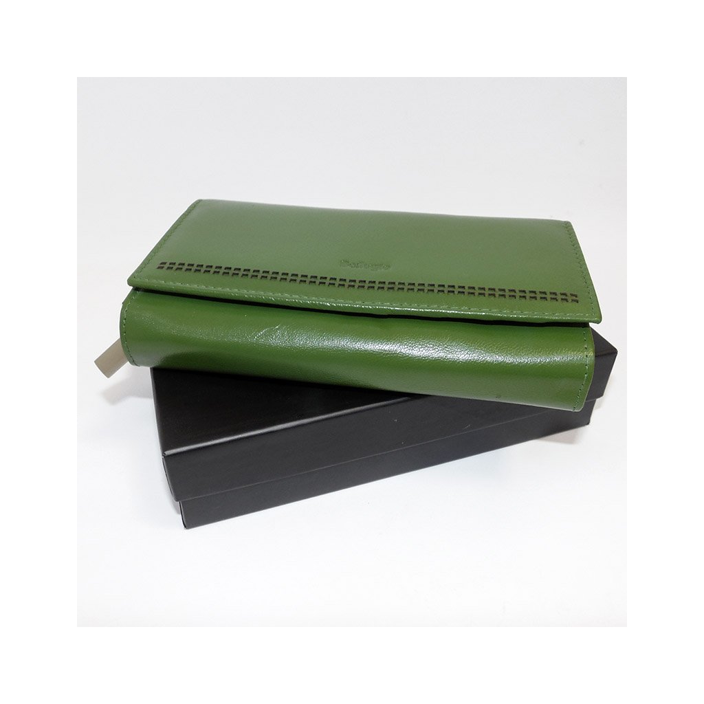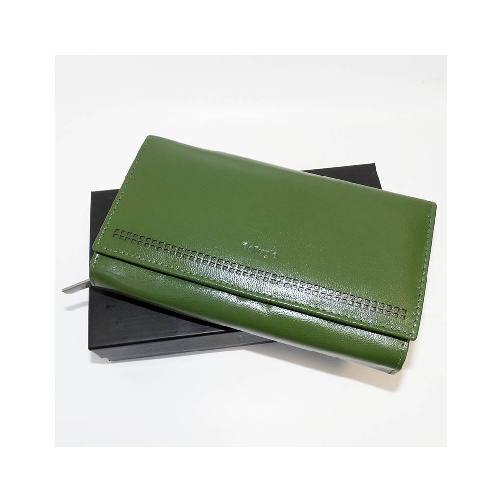 Tato stylová dámská peněženka je vyrobena z pravé hovězí kůže v elegantním zeleném odstínu. Výrazným prvkem je kvalitní červené prošití, které dodává peněžence osobitost a kontrastní vzhled.
