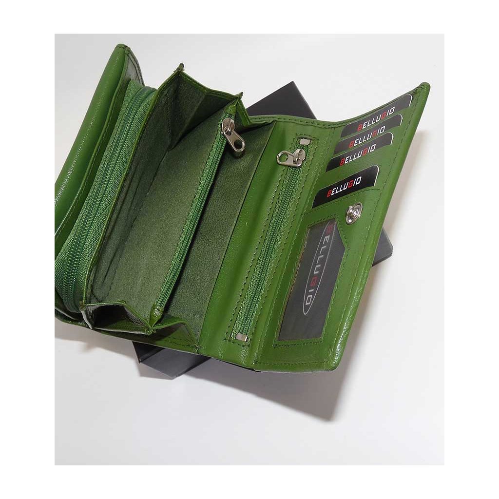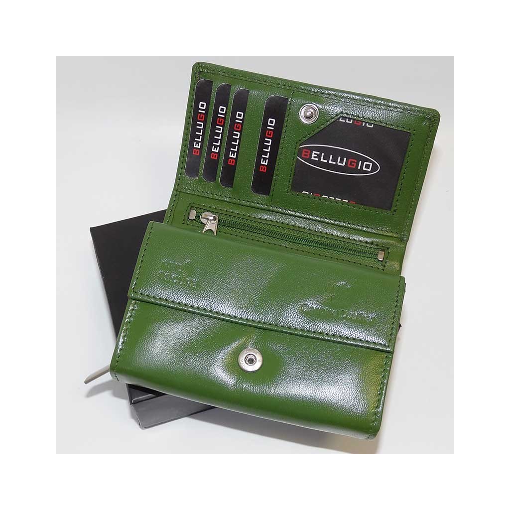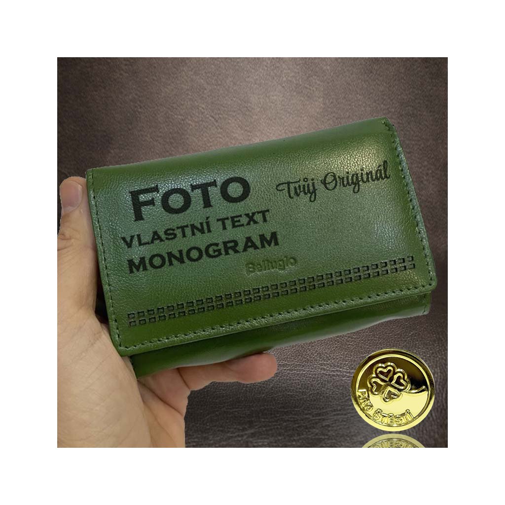 Dámská zelená kožená peněženka BELLUGIO s monogramem a vlastním textem + Akce - zlatá mince Pro štěstí ZDARMA