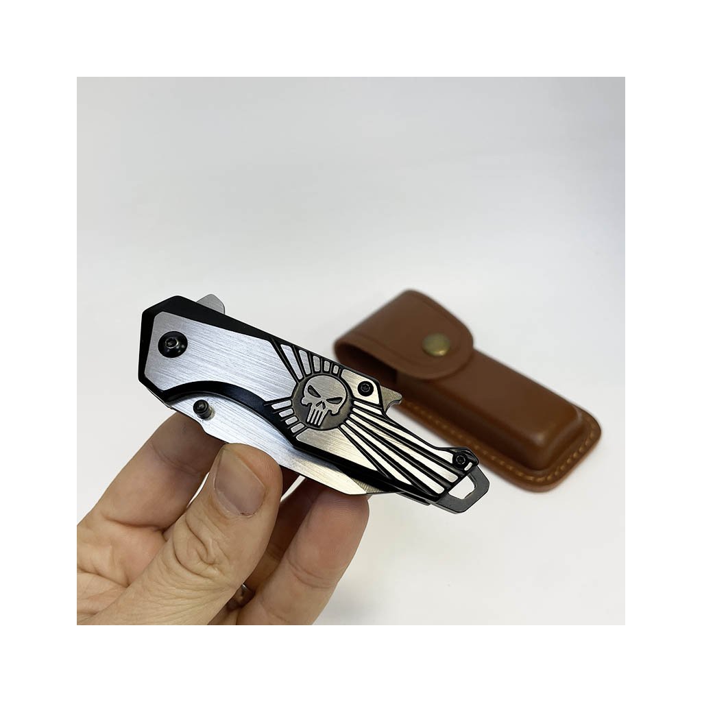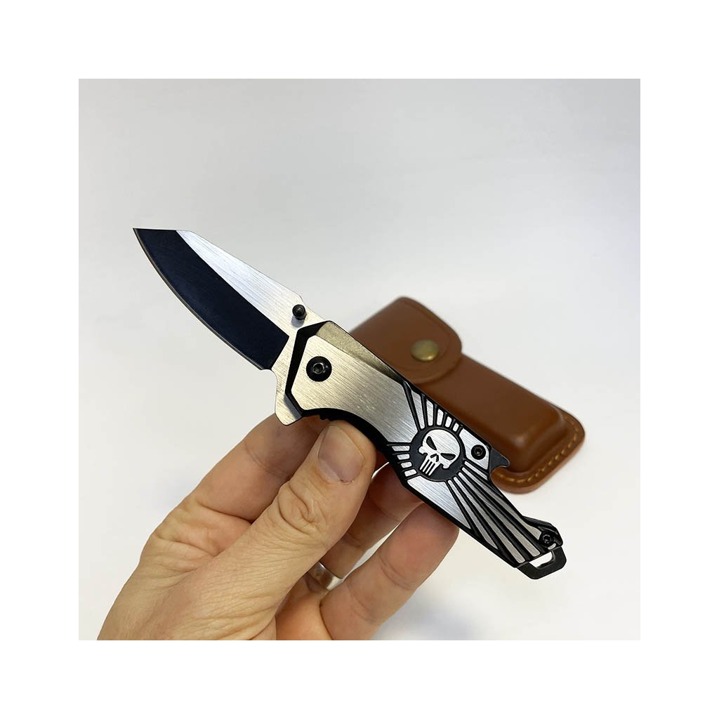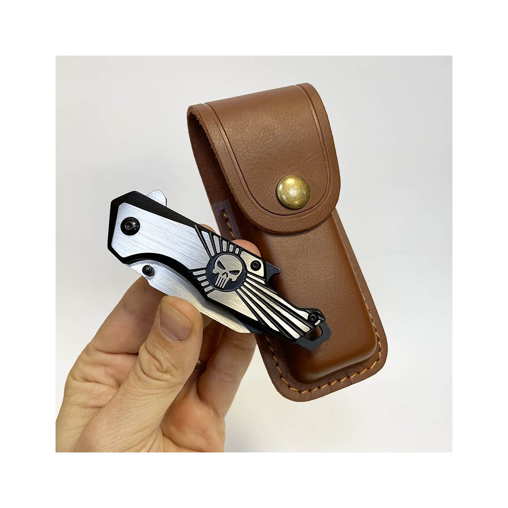 Excelentní kovový vyklápěcí nůž LEBKA s možností koženého pouzdra s vlastním textem + prémiové dárkové balení BE Original