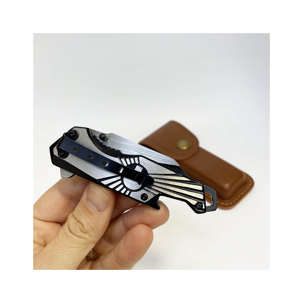 Stylový kovový nůž ve tvaru listu o délce 19 cm (otevřený), včetně koženého pouzdra s možností vlastního gravírování. Unikátní design a praktický doplněk v jednom.