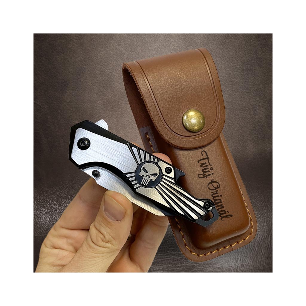 Kvalitní kovový vyklápěcí nůž s lebkou včetně koženého pouzdra, navíc monogram, text, motiv