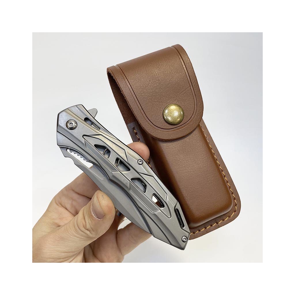 Elegantní šedý kovový vyklápěcí nůž s koženým pouzdrem. Na pouzdro lze vygravírovat osobní text, monogram či motiv. Ideální dárek pro muže s osobností.
