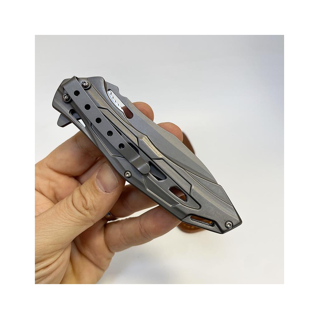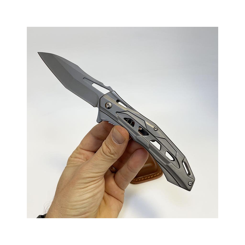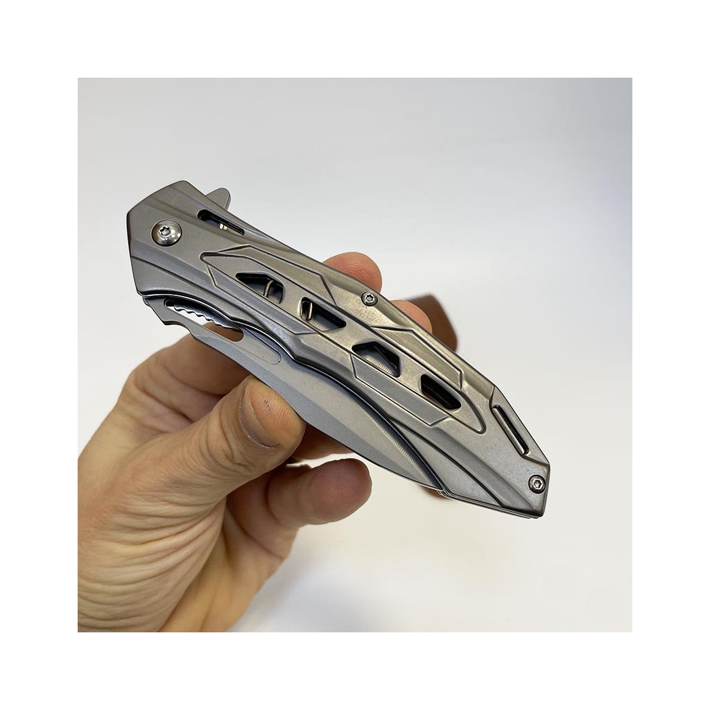 Elegantní šedý kovový vyklápěcí nůž s 13cm rukojetí a koženým pouzdrem. Možnost gravírování vlastního textu, motivu nebo monogramu. Originální dárek s praktickým využitím.