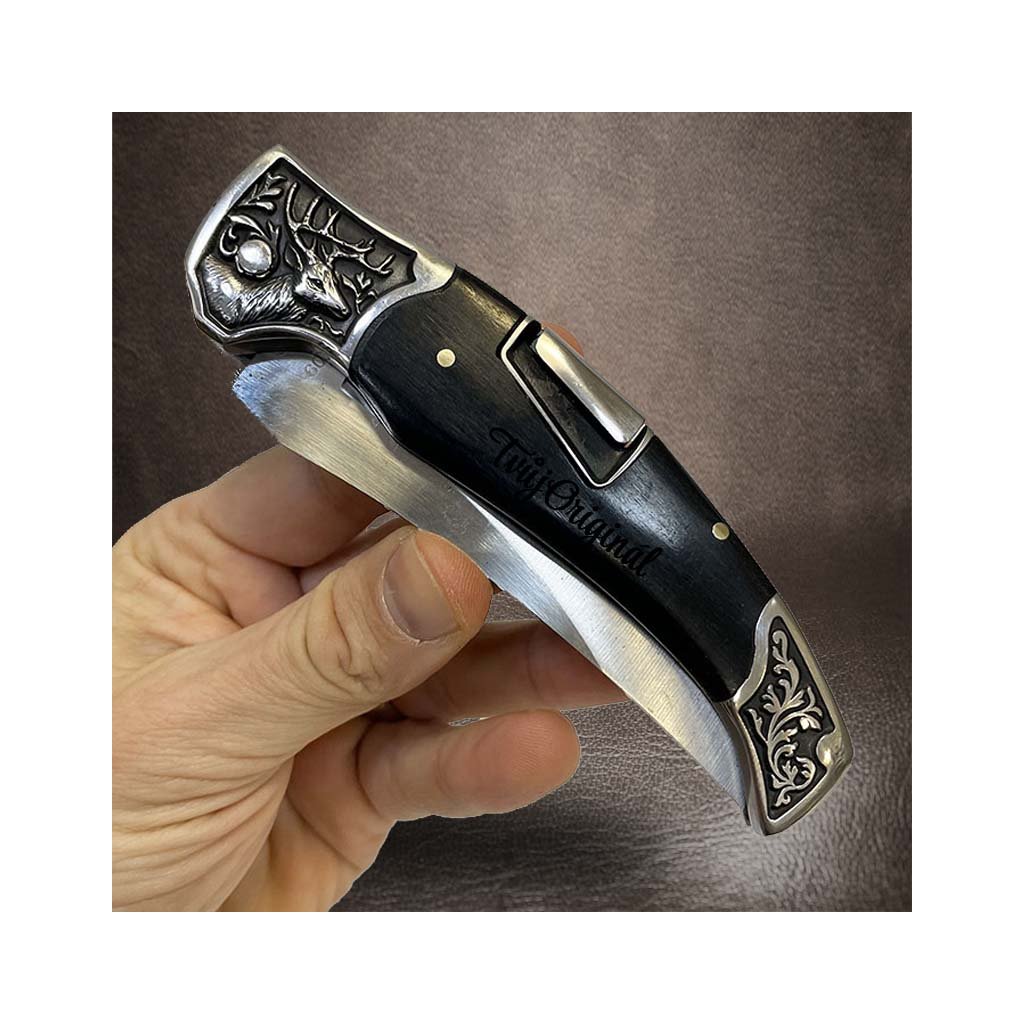 Elegantní vyklápěcí nůž o délce 22 cm (otevřený) s kvalitní dřevěnou rukojetí. Možnost gravírování vlastního textu nebo monogramu. Ideální jako originální dárek.