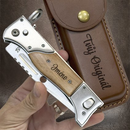 Stylový kvalitní vyklápěcí nůž s dřevěnou rukojetí a možností gravírování vlastního textu. K noži lze dokoupit kožené pouzdro s personalizací – ideální dárek na míru.