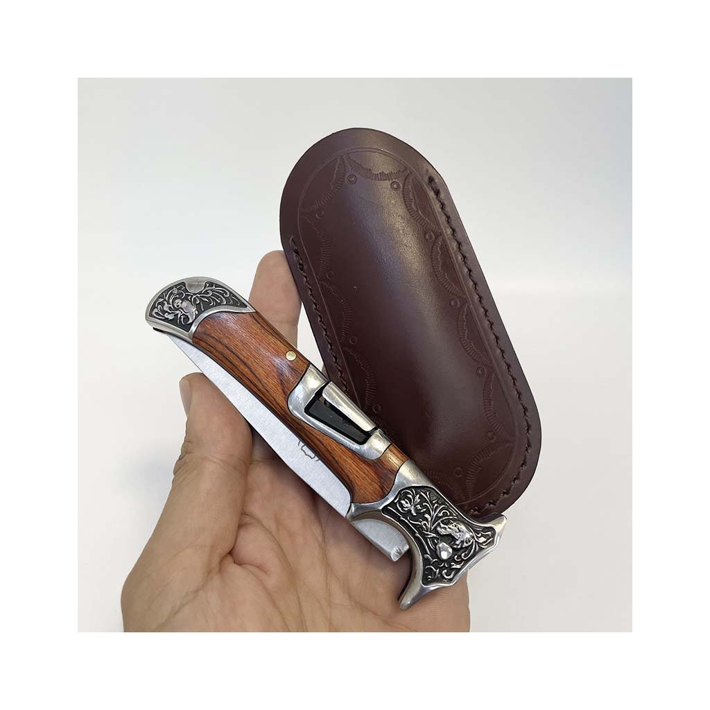Kvalitní vyklápěcí nůž s dřevěnou rukojetí a koženým pouzdrem. Včetně gravírování vlastního textu – ideální jako osobní dárek pro každého muže.