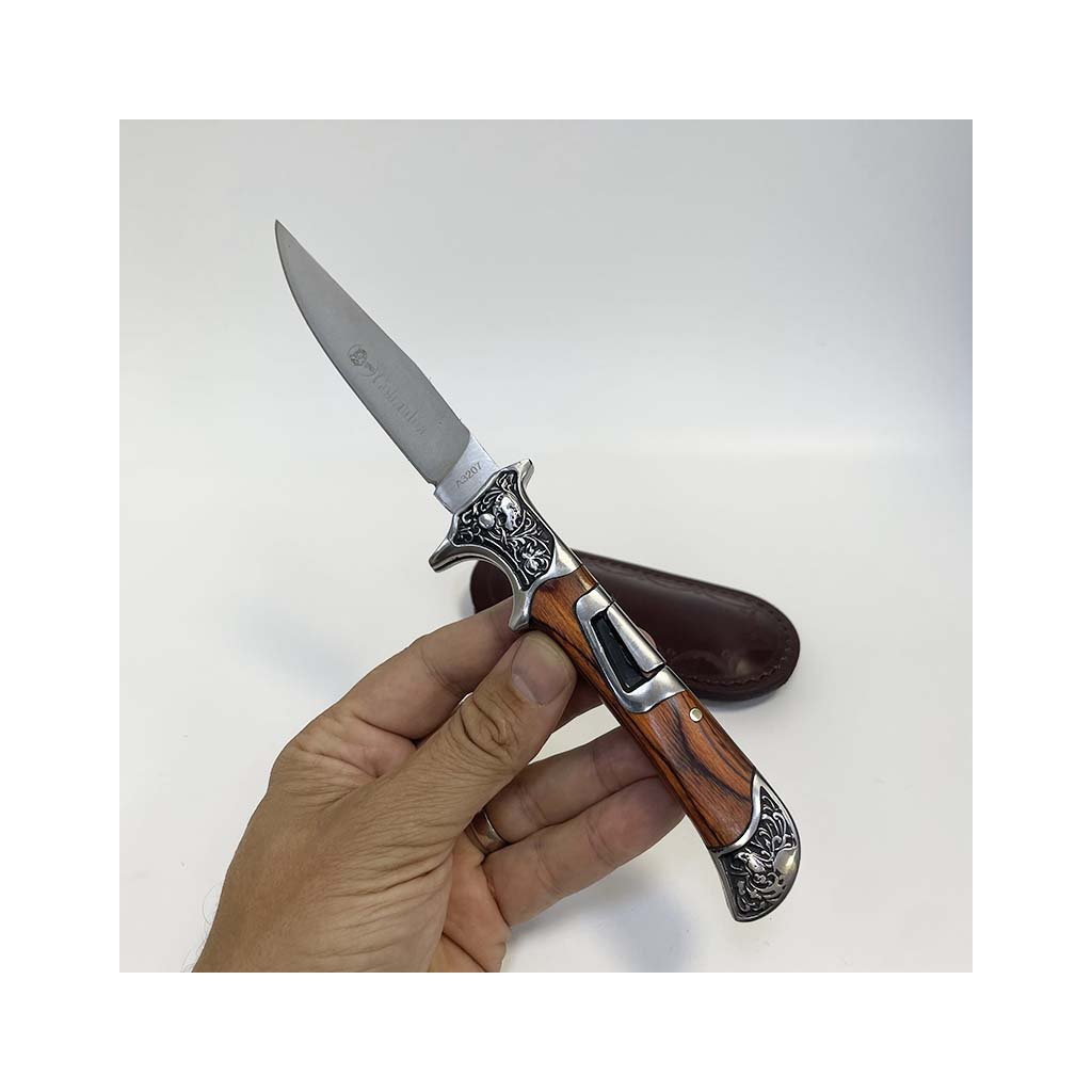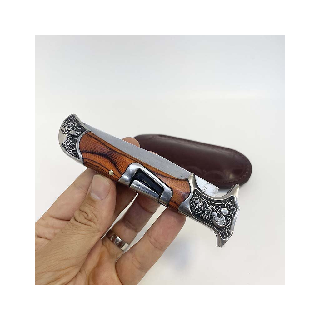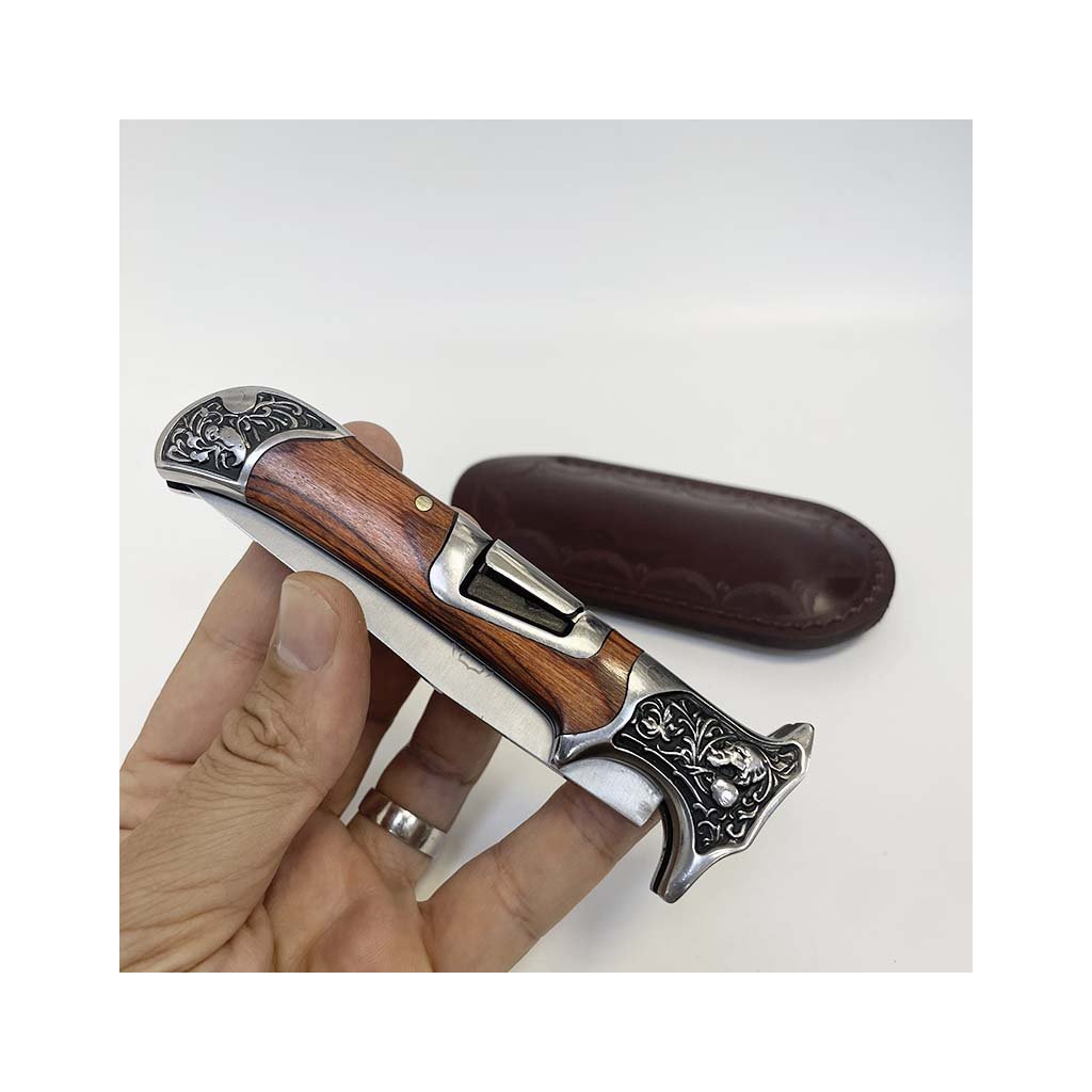 Robustní vyklápěcí nůž s dřevěnou rukojetí, gravírováním a koženým pouzdrem. Vhodné jako originální dárek s vlastním věnováním. Prémiová kvalita.