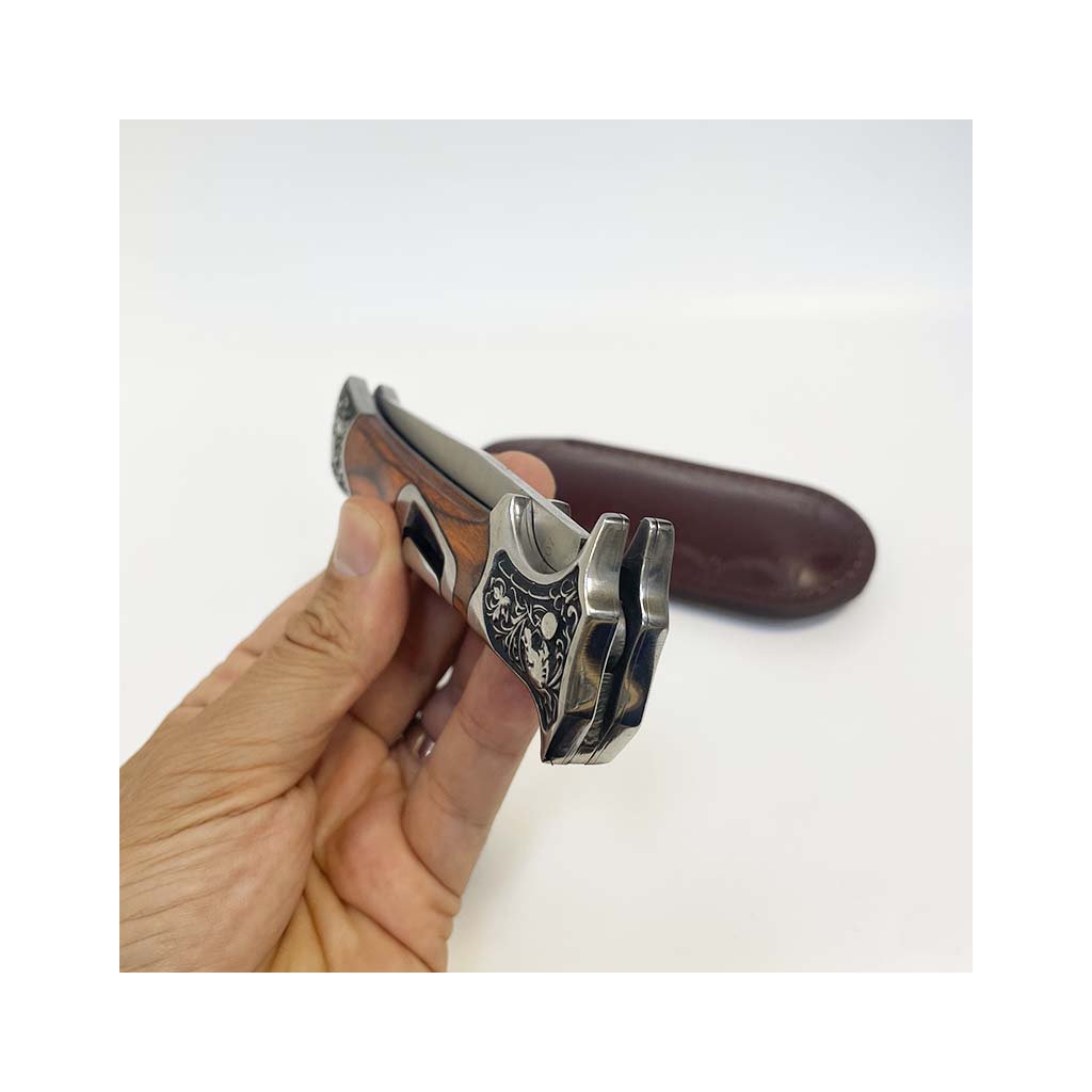 Exkluzivní vyklápěcí nůž s dřevěnou rukojetí (11 cm), vhodnou pro gravírování textu nebo monogramu. Délka nože při otevření 20,5 cm. Včetně koženého pouzdra. Perfektní dárek s...