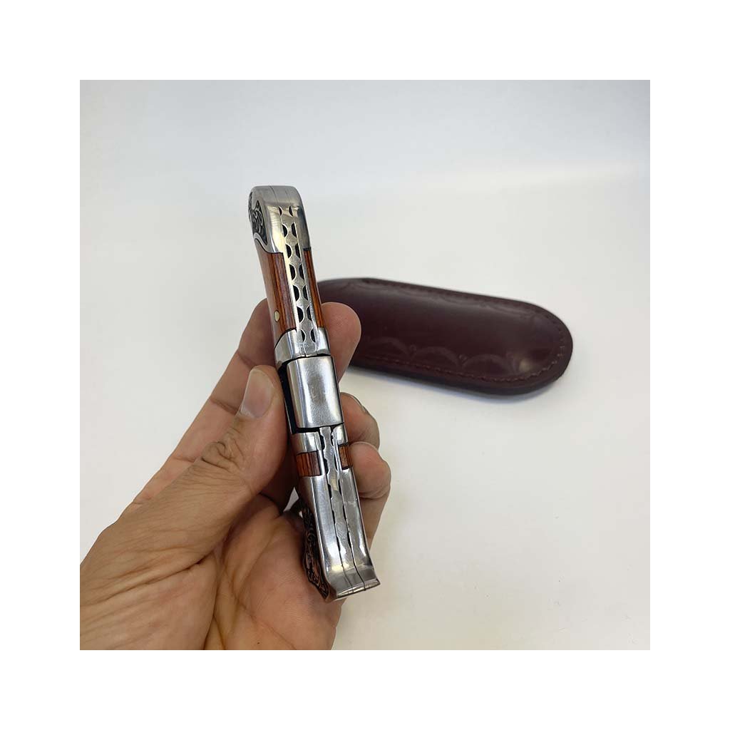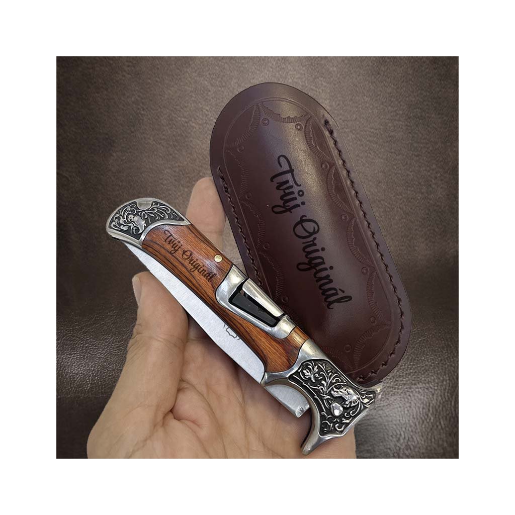 Stylový kvalitní vyklápěcí nůž s dřevěnou rukojetí a možností gravírování vlastního textu. K noži lze dokoupit kožené pouzdro s personalizací – ideální dárek na míru.