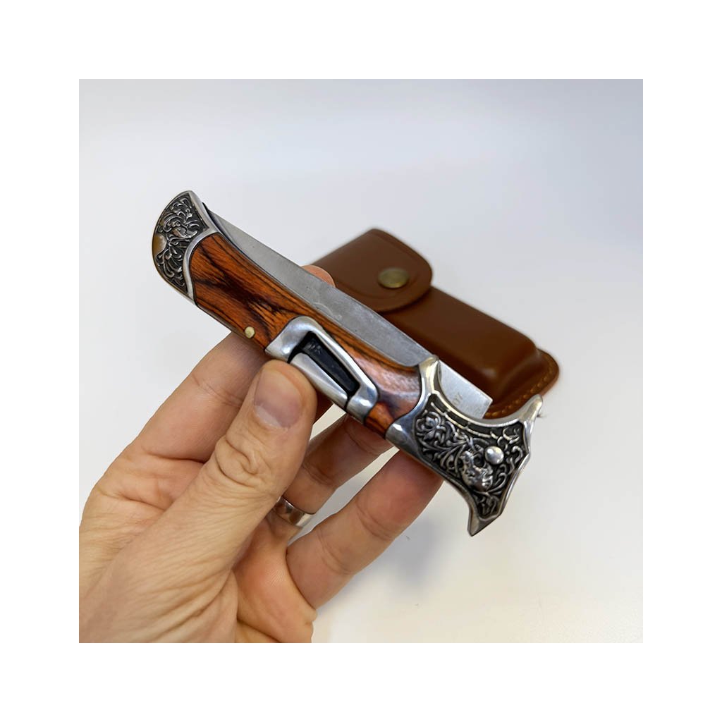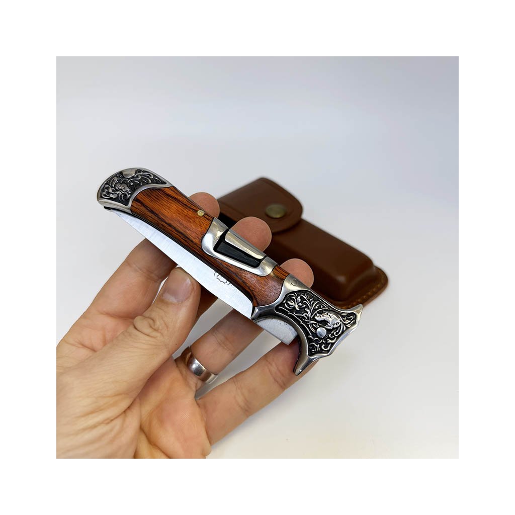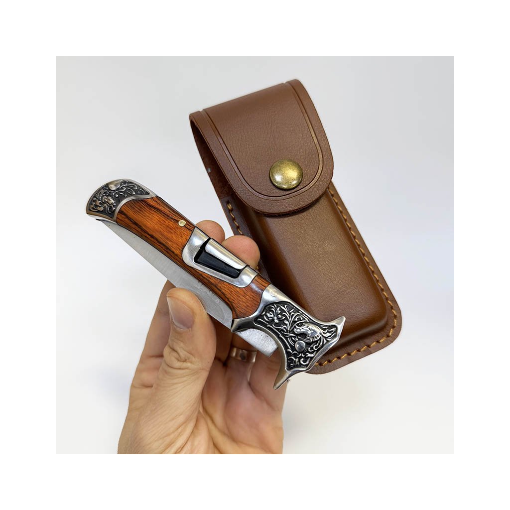 Robustní vyklápěcí nůž s dřevěnou rukojetí, gravírováním a koženým pouzdrem. Vhodné jako originální dárek s vlastním věnováním. Prémiová kvalita.