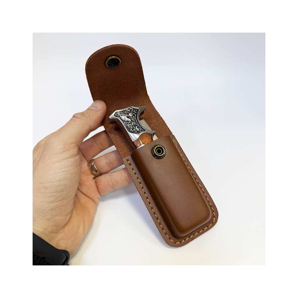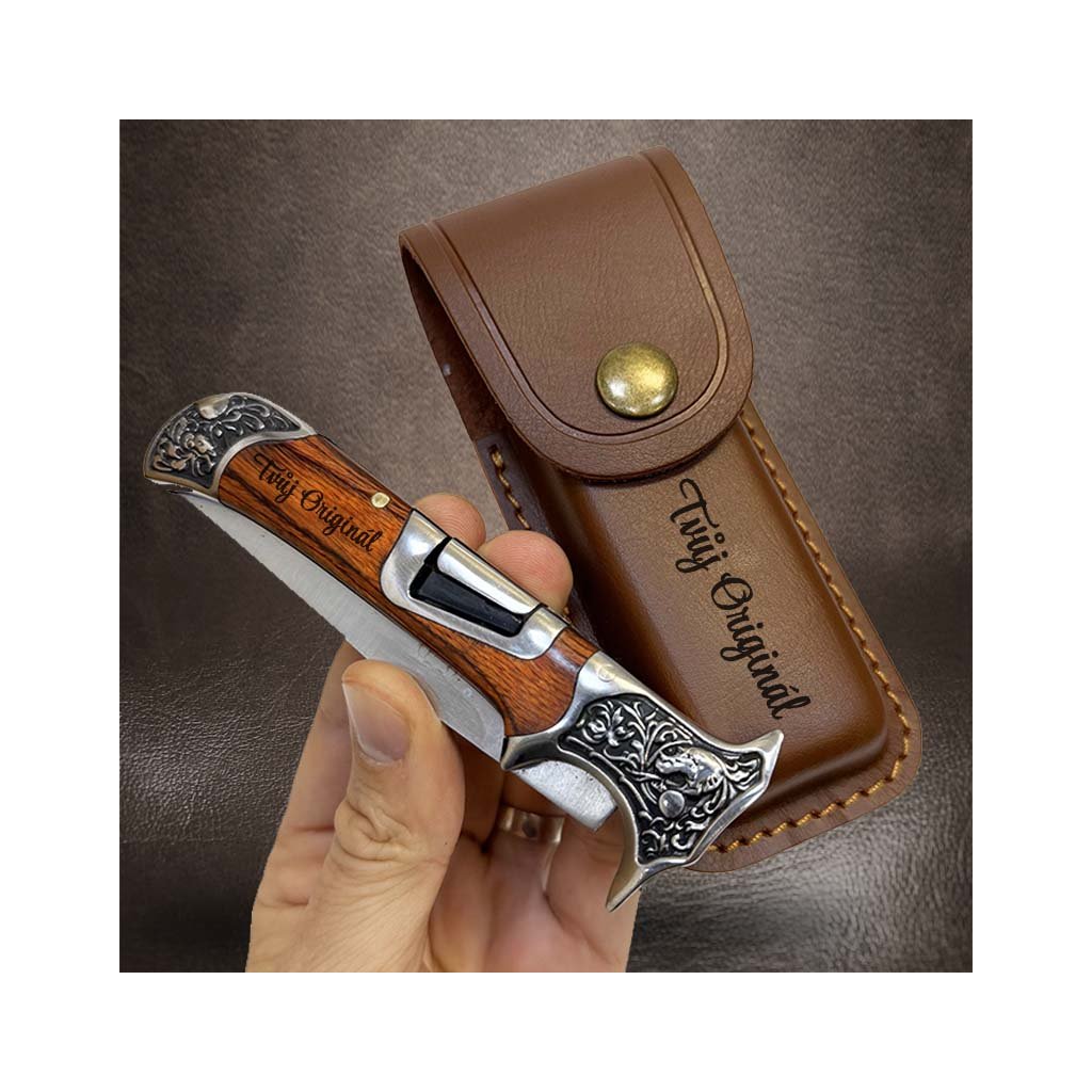 Kvalitní vyklápěcí nůž s dřevěnou rukojetí a koženým pouzdrem. Včetně gravírování vlastního textu – ideální jako osobní dárek pro každého muže.