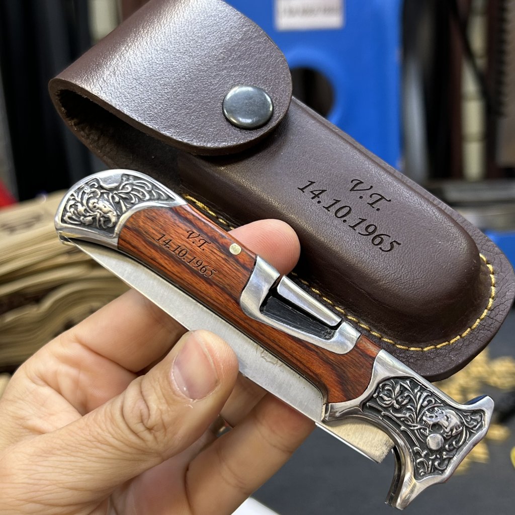 Prémiový vyklápěcí nůž s možností vlastního textu nebo monogramu na dřevěnou rukojeť. Spojení kvality, praktičnosti a originality – ideální jako osobní dárek nebo stylový doplněk