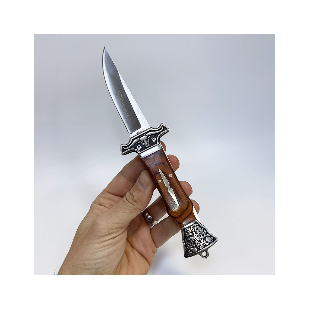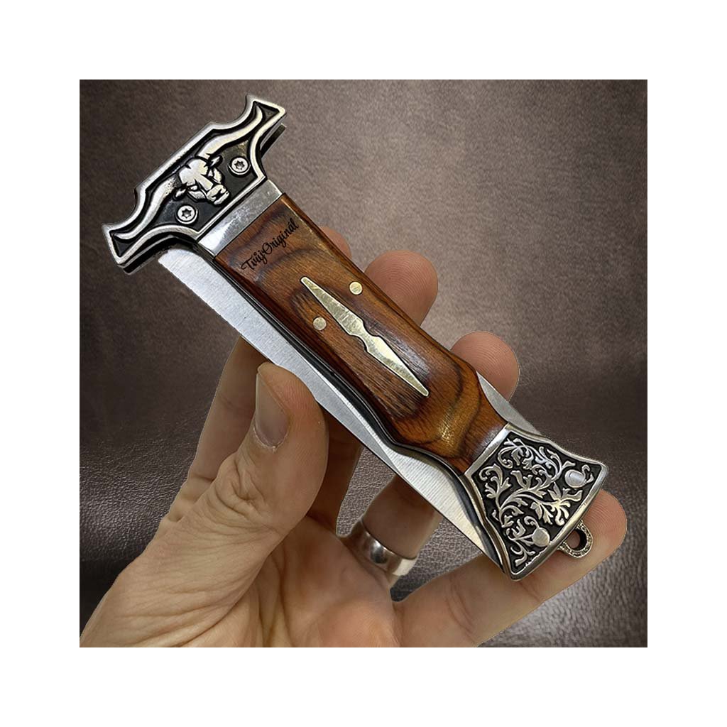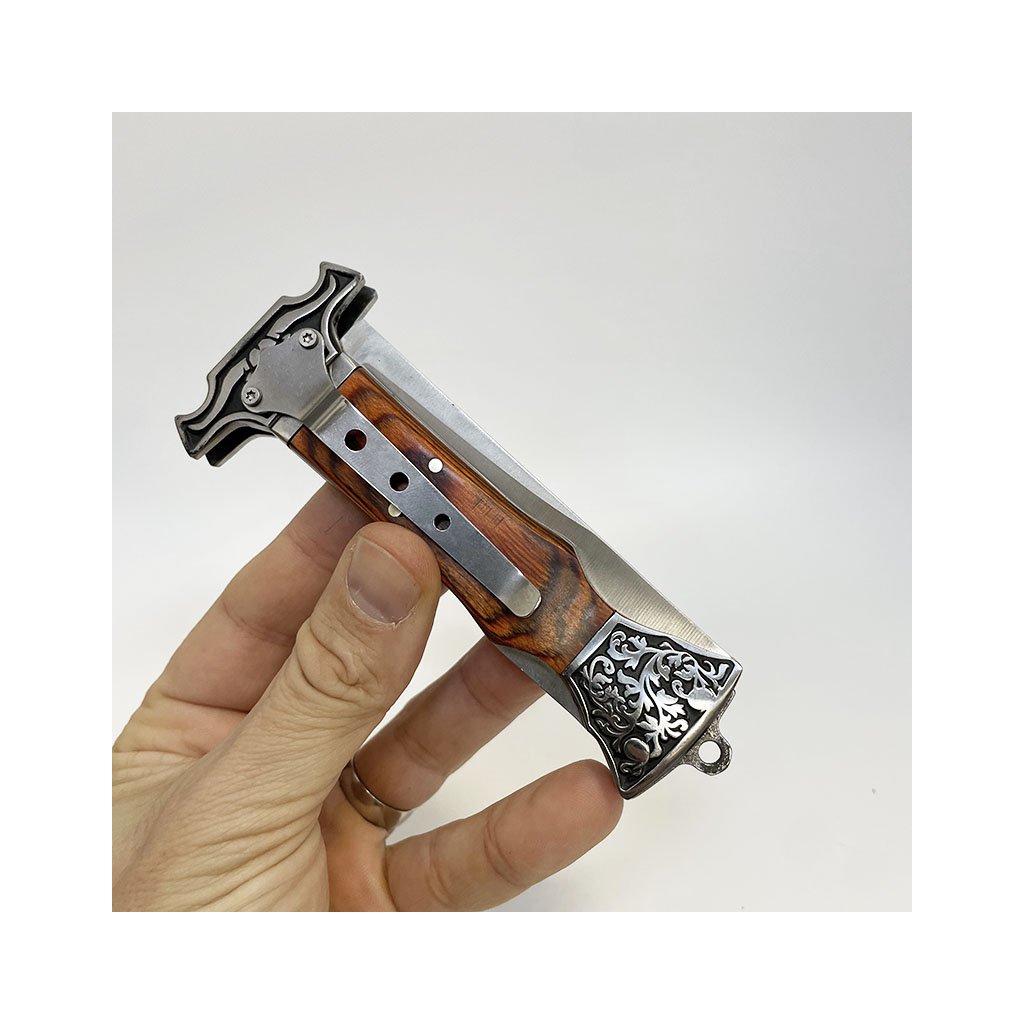 Stylový kvalitní vyklápěcí nůž s dřevěnou rukojetí a možností gravírování vlastního textu. K noži lze dokoupit kožené pouzdro s personalizací – ideální dárek na míru.