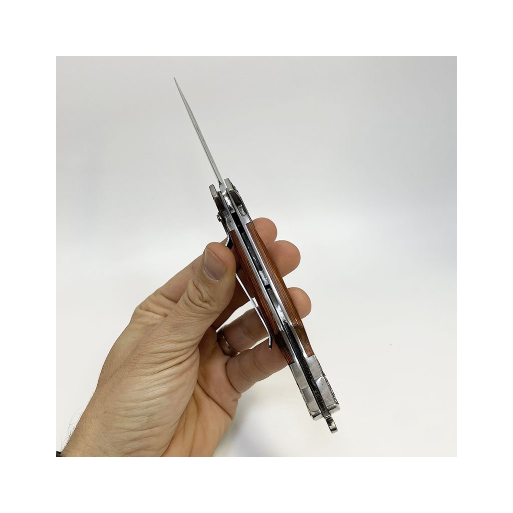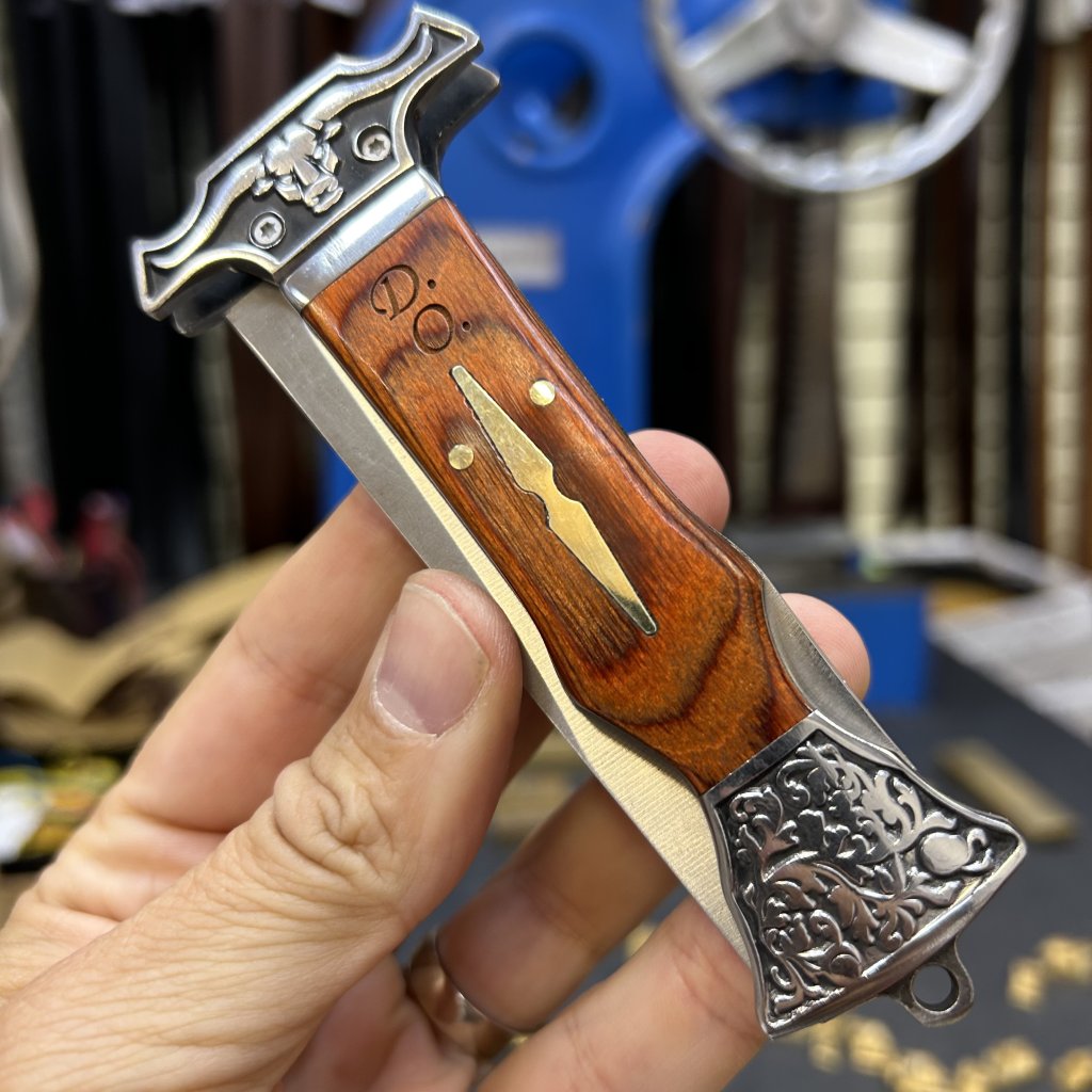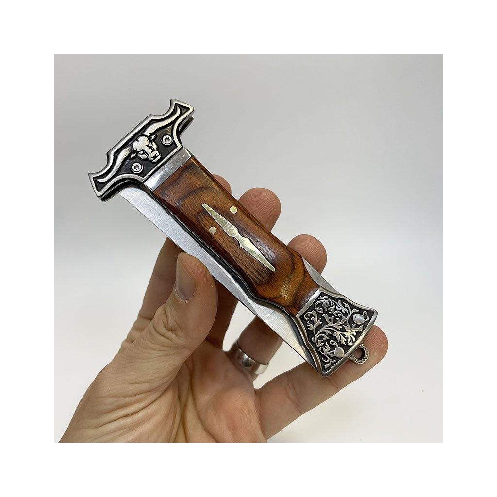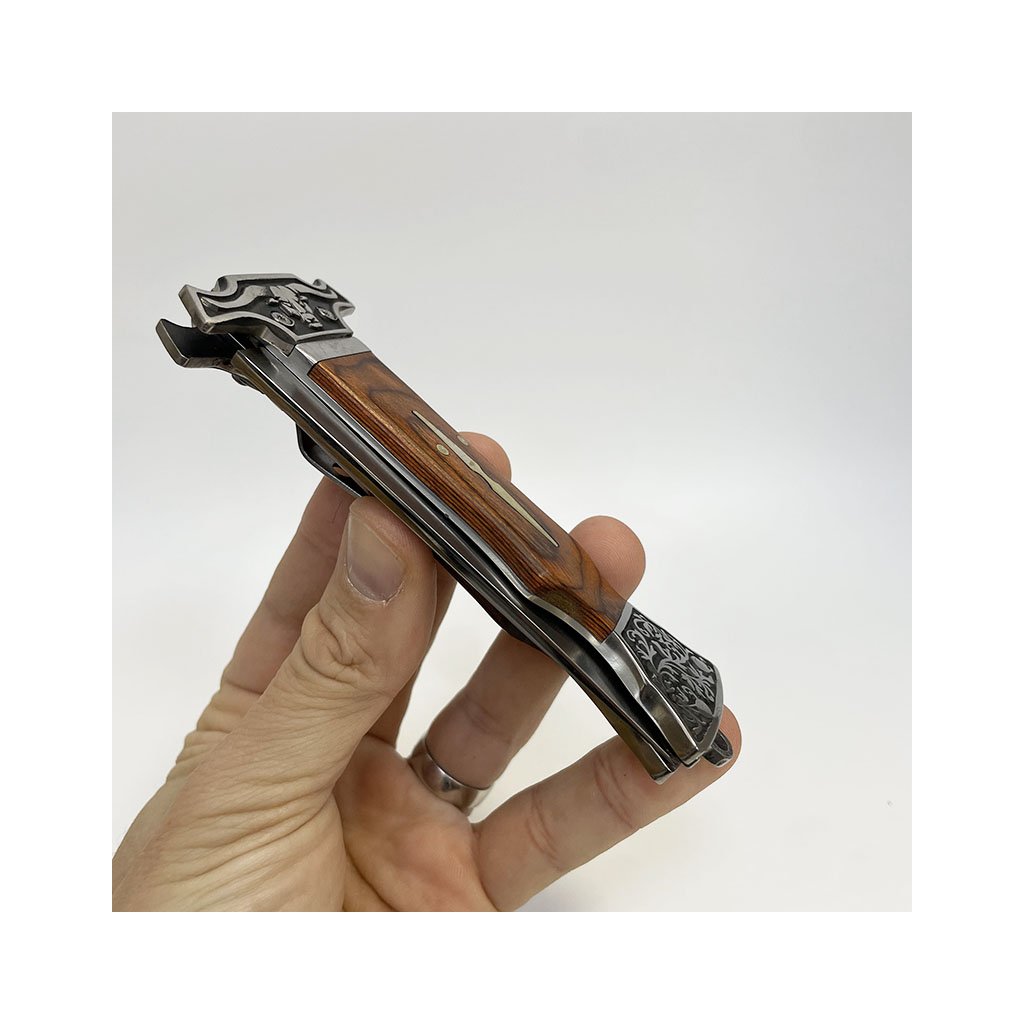 Stylový kvalitní vyklápěcí nůž s dřevěnou rukojetí a možností gravírování vlastního textu. K noži lze dokoupit kožené pouzdro s personalizací – ideální dárek na míru.
