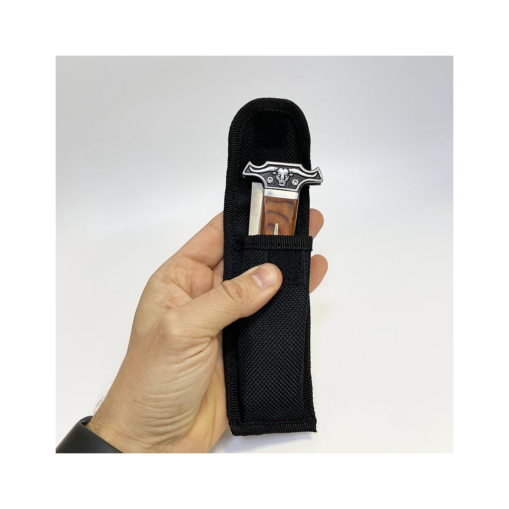 Elegantní černý vyklápěcí nůž s délkou 22,5 cm při otevření a dřevěnou rukojetí pro vlastní text. Včetně koženého pouzdra. Originální dárek s osobním dotekem.