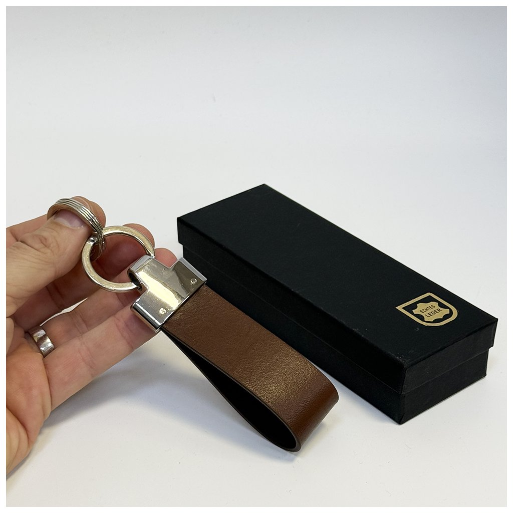 Pevná hnědá kožená klíčenka BEORIGINAL s možností vlastního textu nebo monogramu. Elegantní doplněk, který z každodenního předmětu udělá osobní originál.