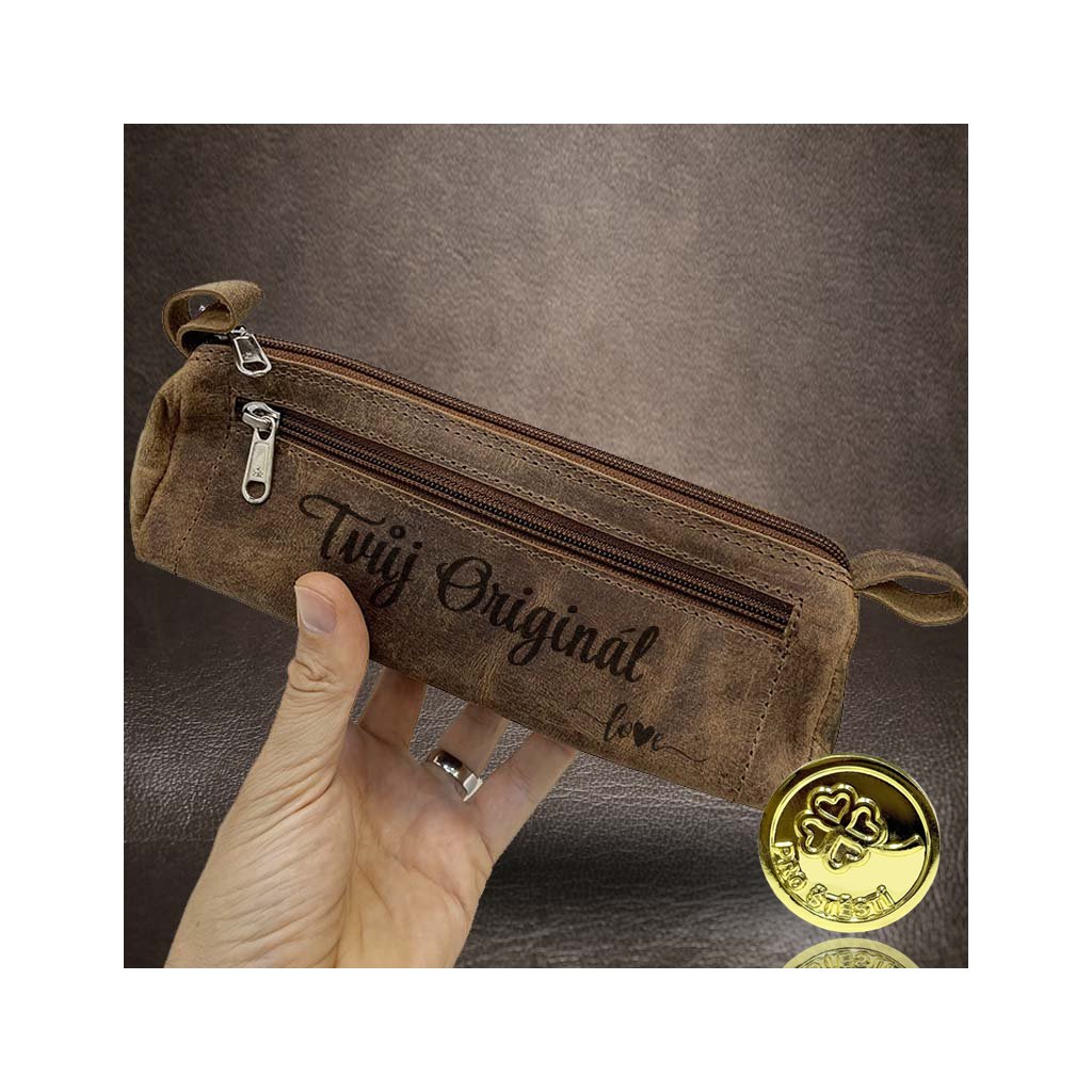 Kompaktní hnědá kožená peněženka taštička BEORIGINAL Leather s monogramem a vlastním textem + Akce - zlatá mince Pro štěstí ZDARMA