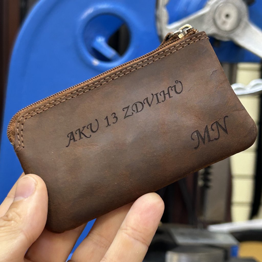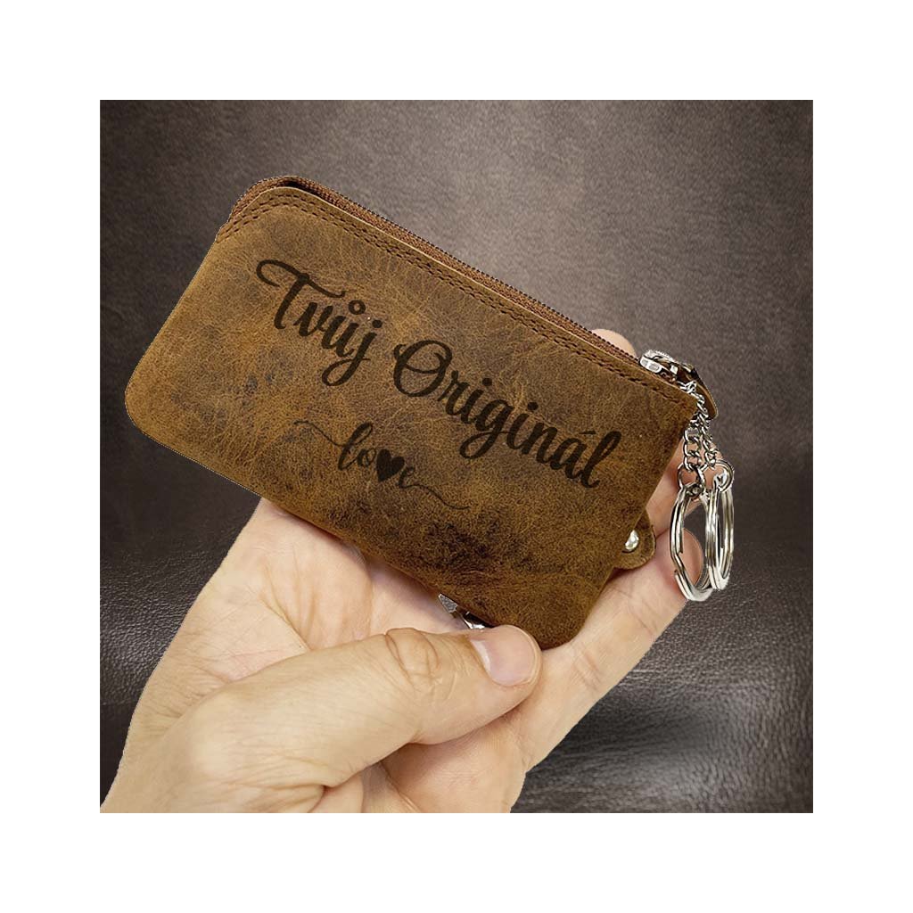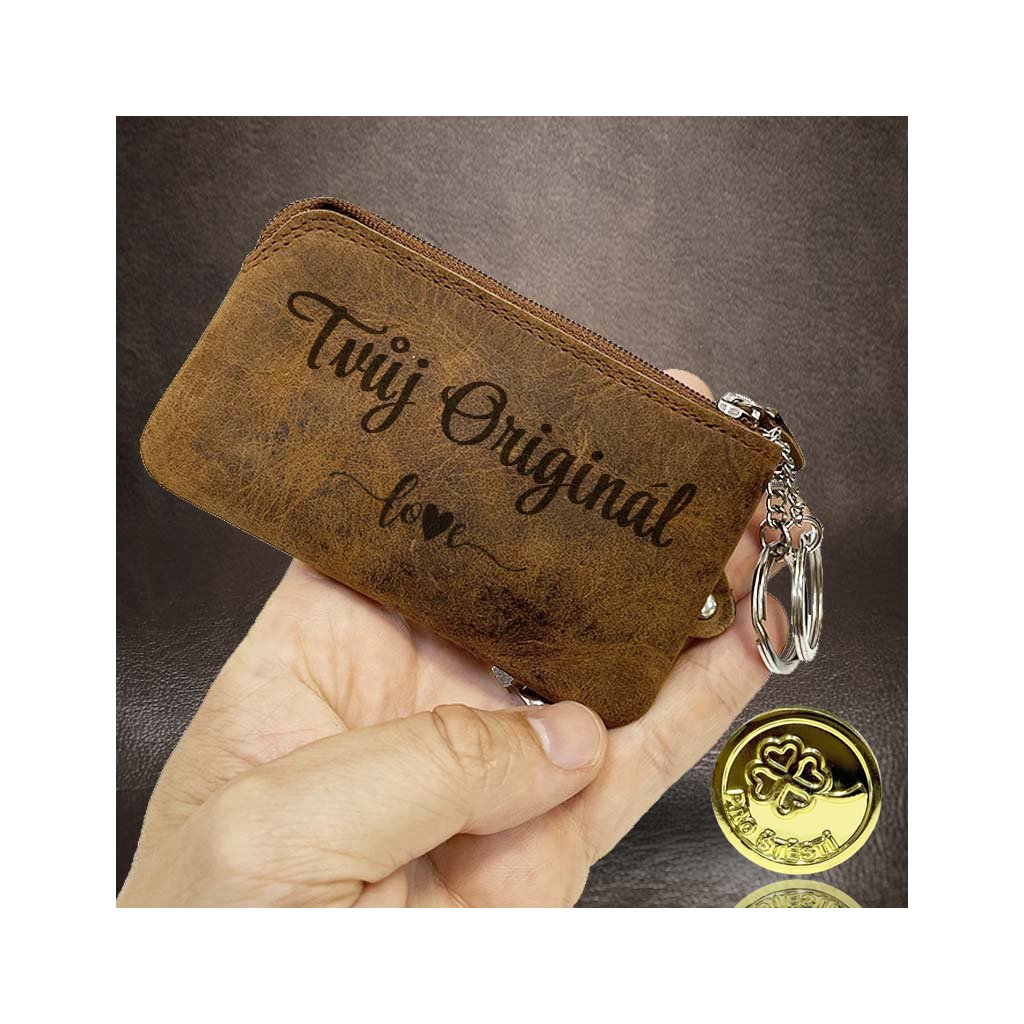 Kožené klíčenka, pouzdro na drobné BEORIGINAL LEATHER s tvým vlastním monogramem a textem + Akce - zlatá mince Pro štěstí ZDARMA