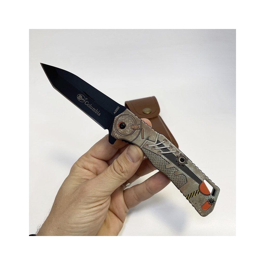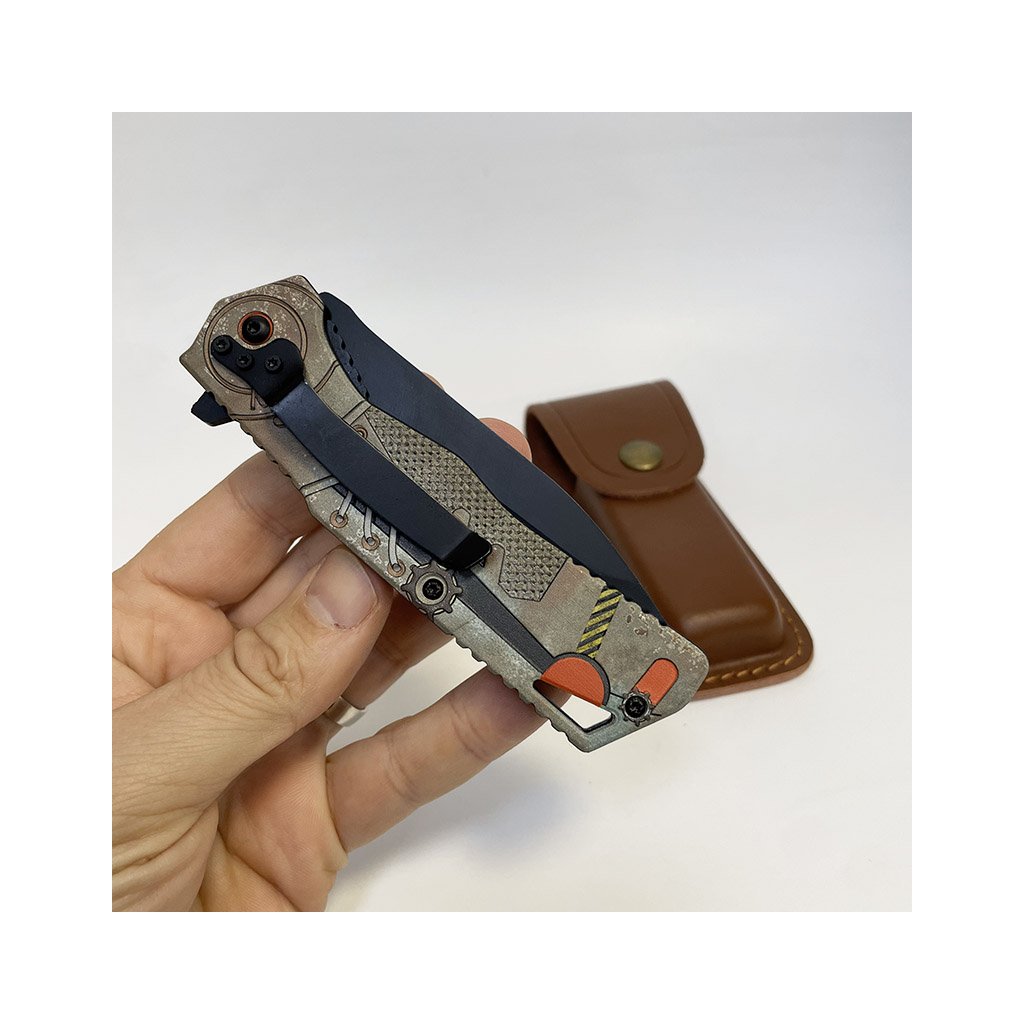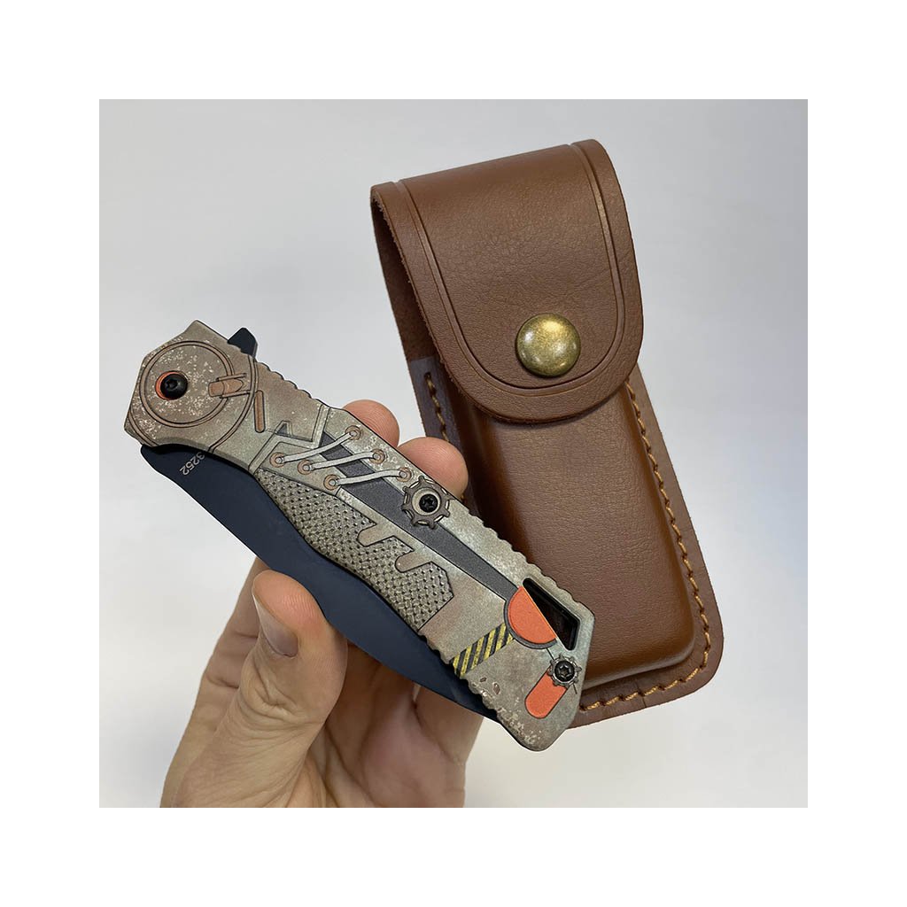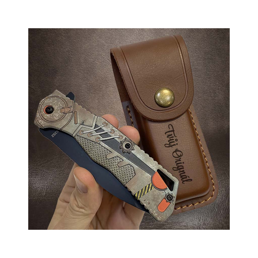 Kvalitní kovový vyklápěcí nůž INDUSTRY s koženým pouzdrem a vlastním textem + prémiové dárkové balení BE Original