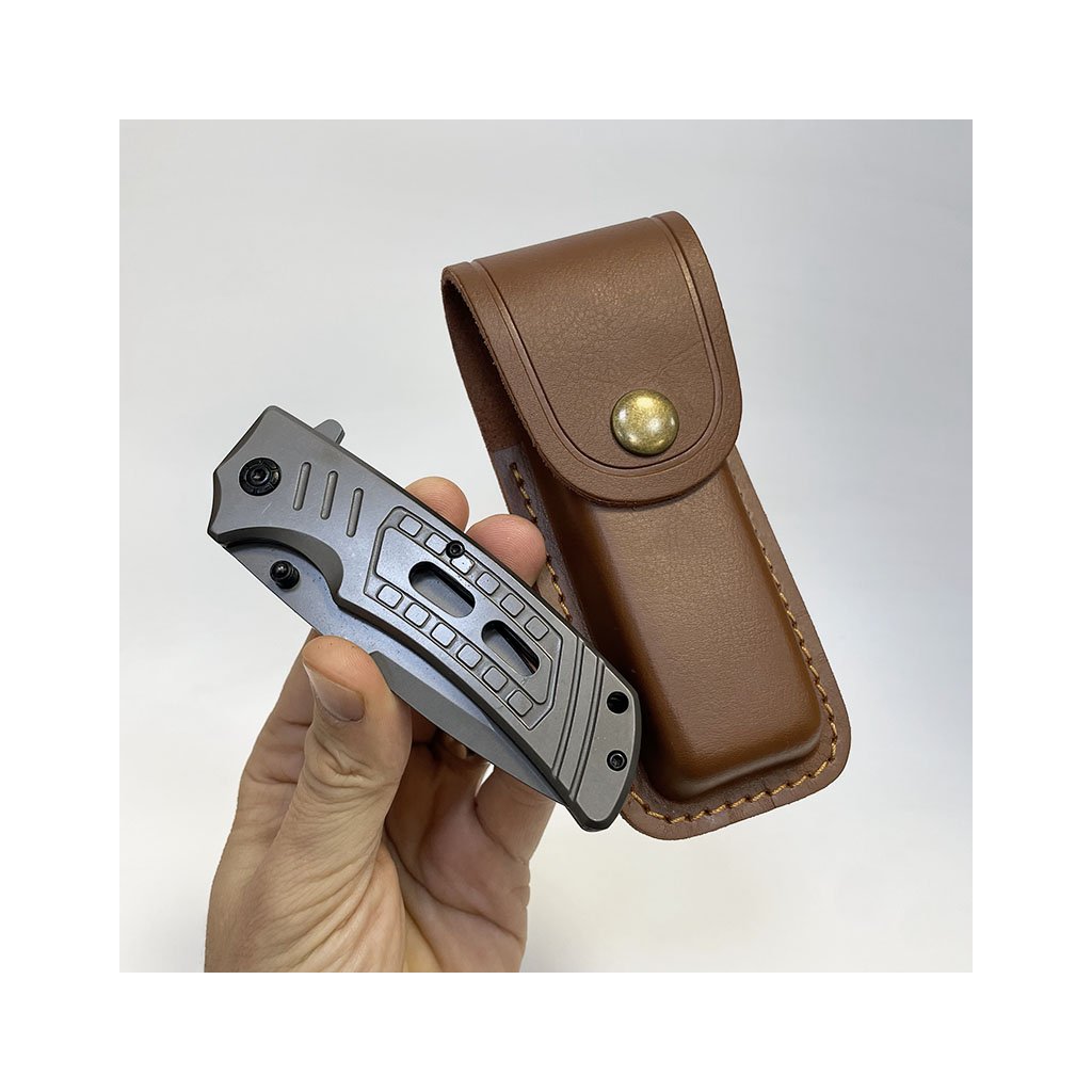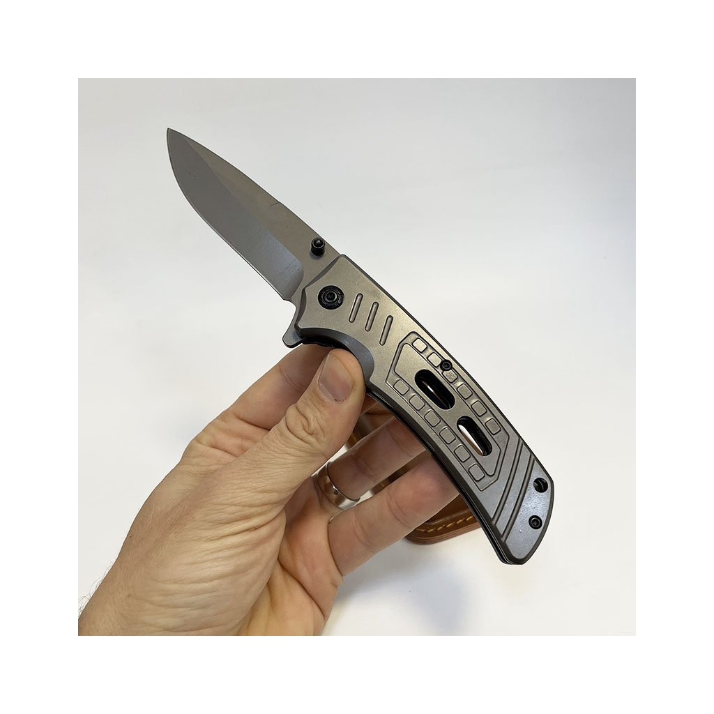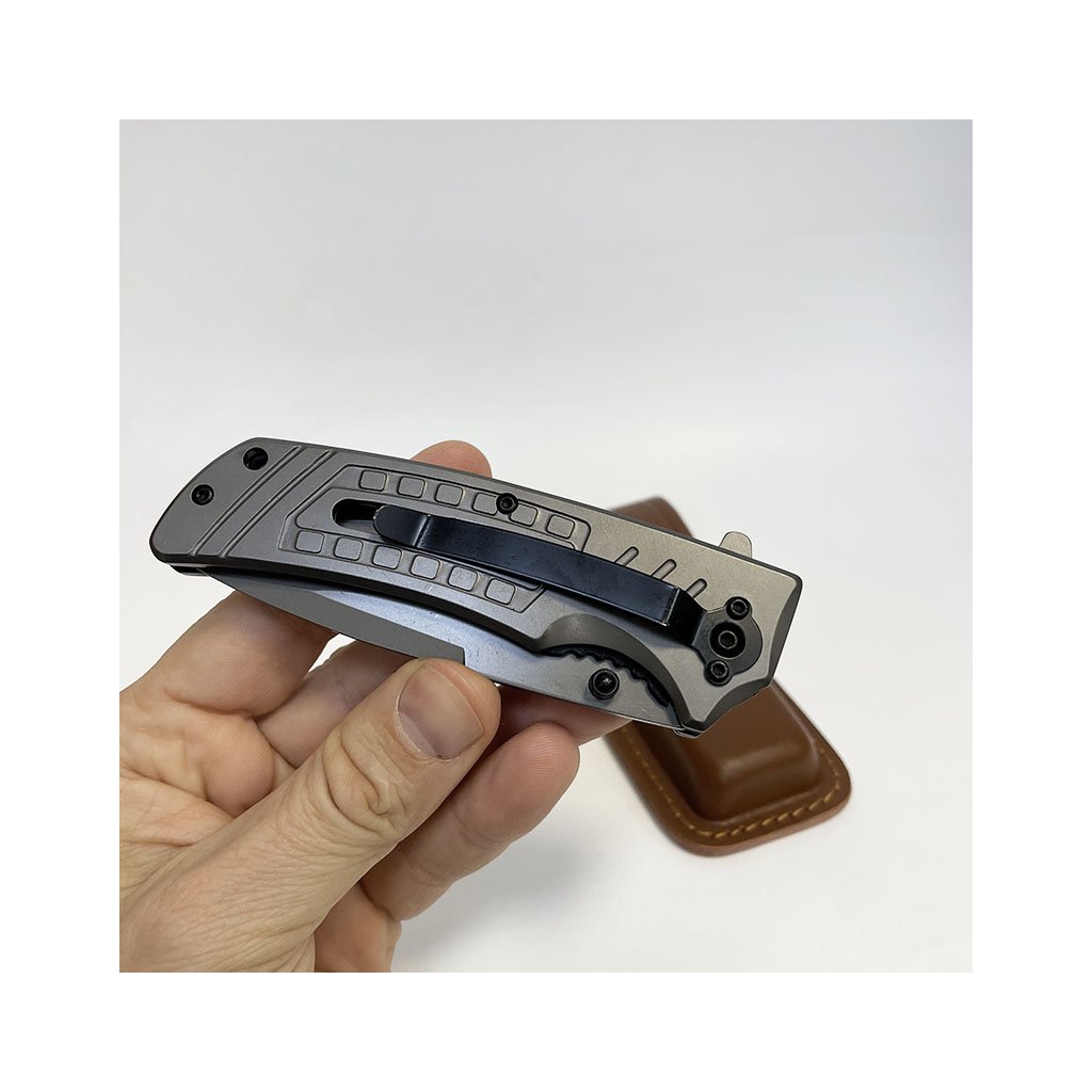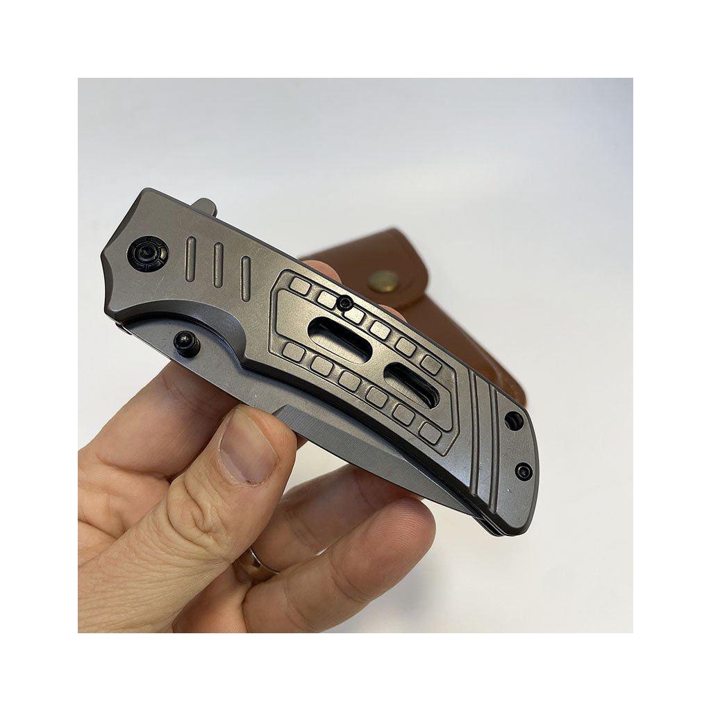 Elegantní šedý kovový vyklápěcí nůž s 13cm rukojetí a koženým pouzdrem. Možnost gravírování vlastního textu, motivu nebo monogramu. Originální dárek s praktickým využitím.