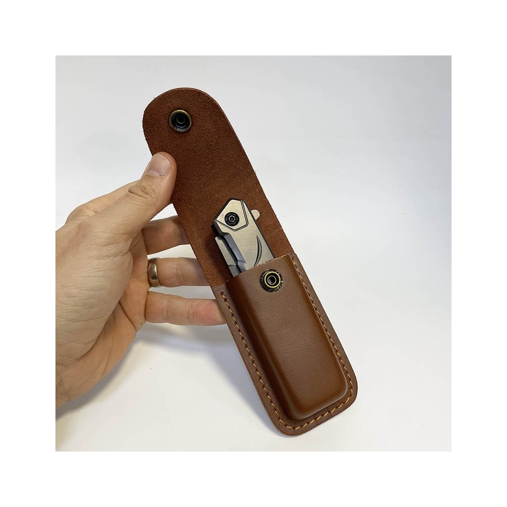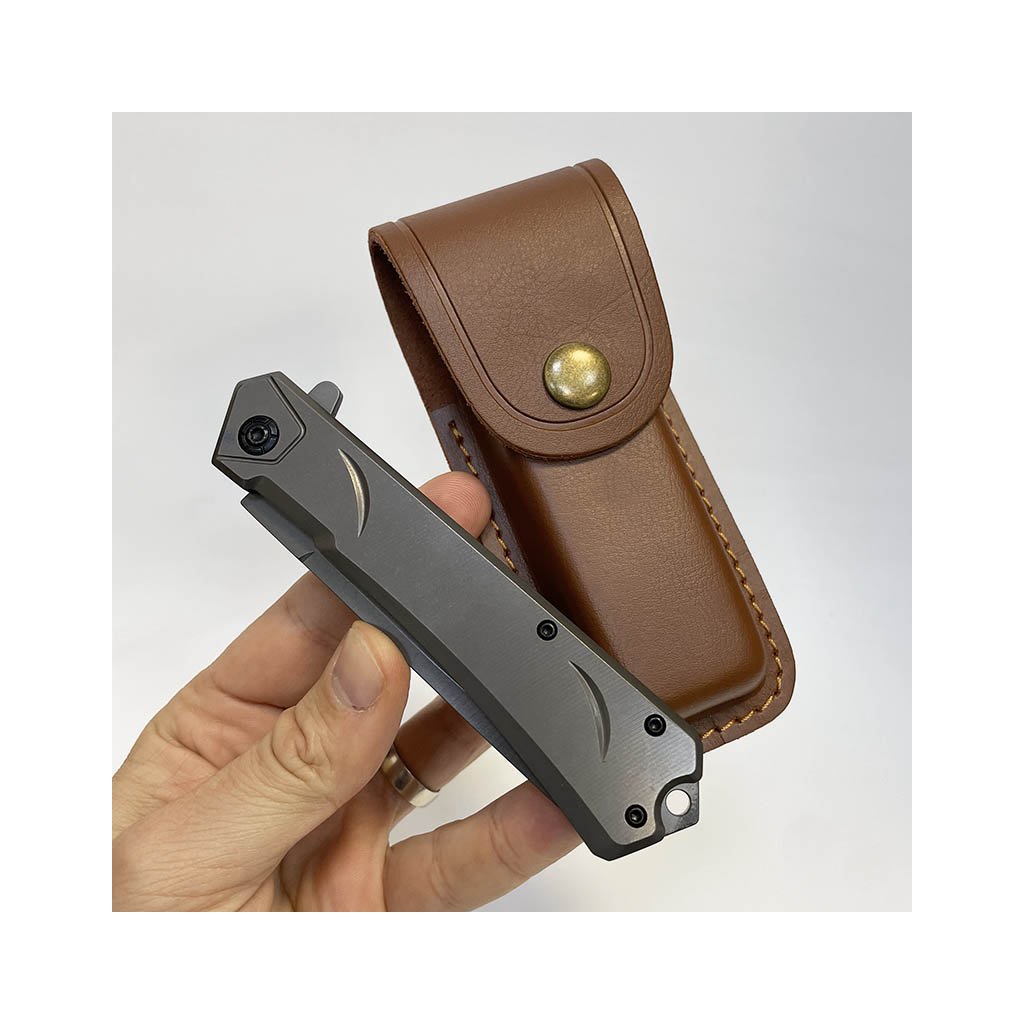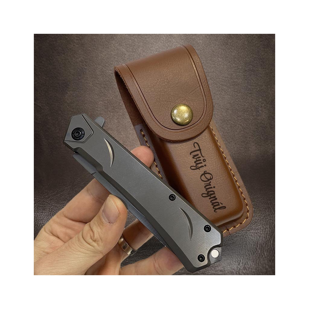 Elegantní kovový nůž s délkou 21 cm (otevřený) a koženým pouzdrem. Možnost gravírování vlastního textu, monogramu či motivu přímo na pouzdro. Stylový a osobitý dárek.
