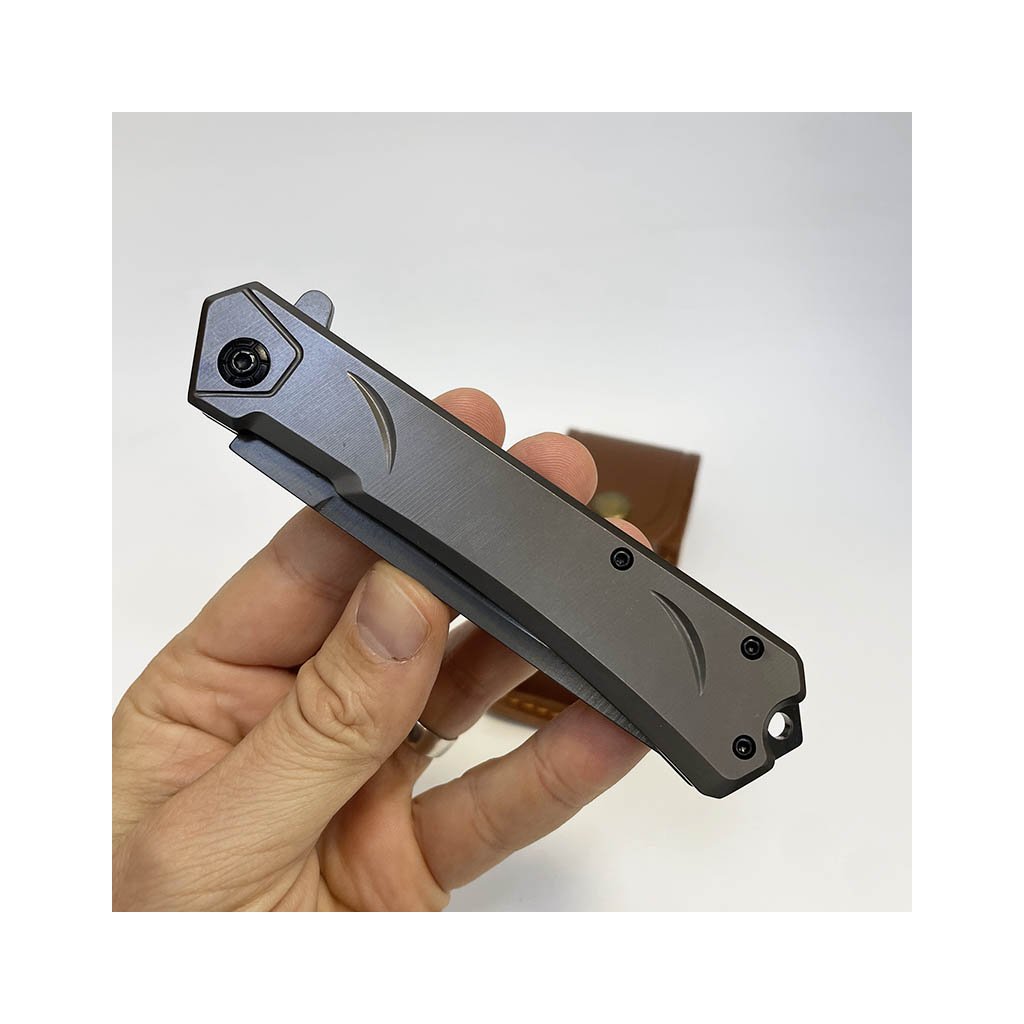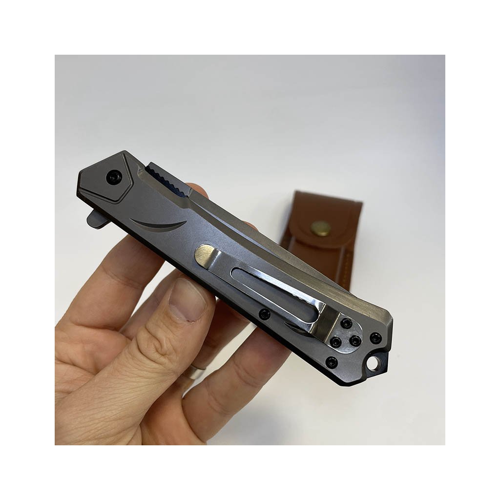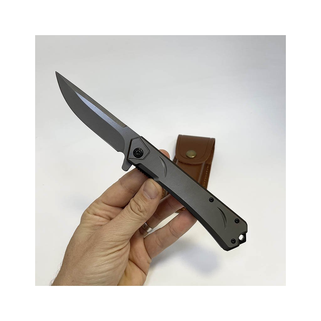 Elegantní šedý kovový vyklápěcí nůž s koženým pouzdrem. Na pouzdro lze vygravírovat osobní text, monogram či motiv. Ideální dárek pro muže s osobností.