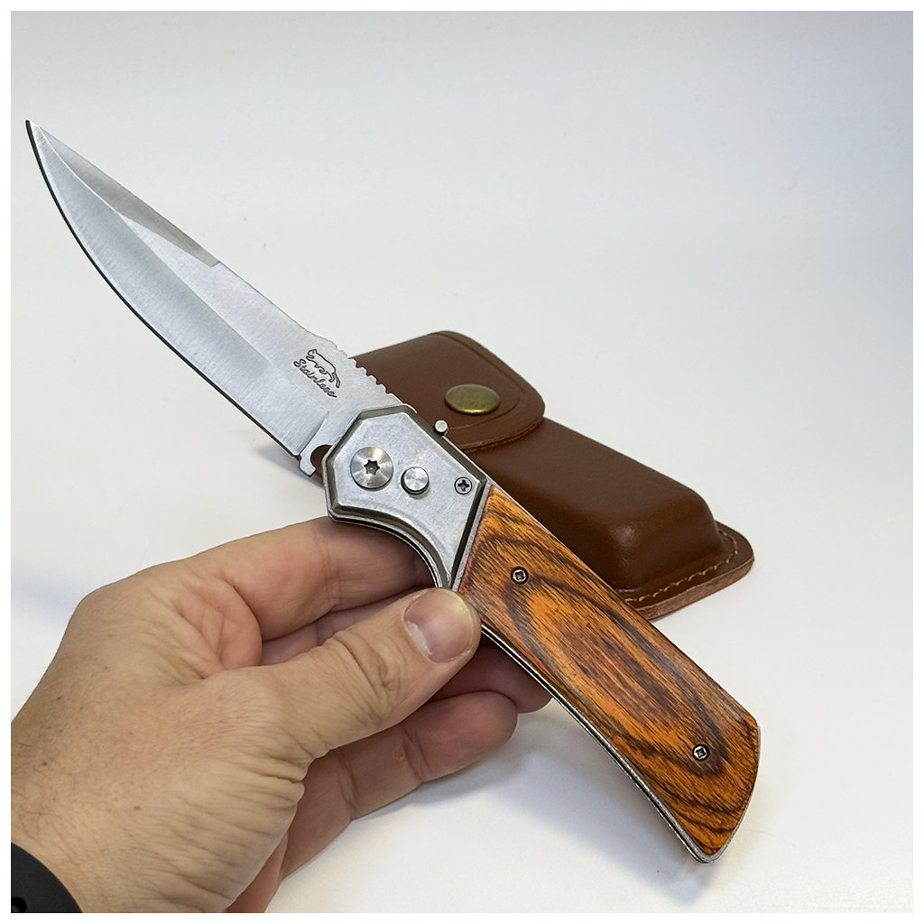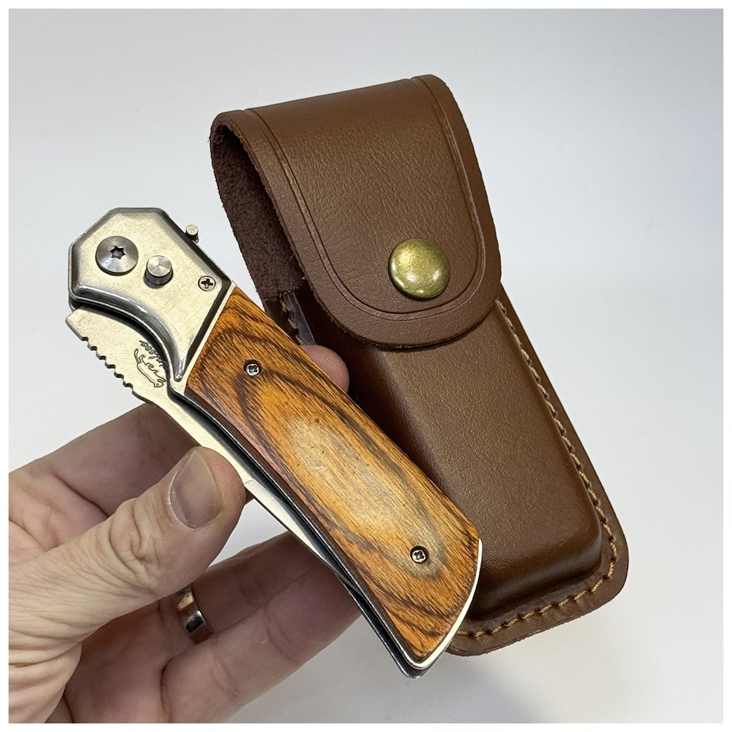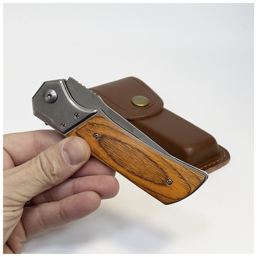 Stylový kvalitní vyklápěcí nůž s dřevěnou rukojetí a možností gravírování vlastního textu. K noži lze dokoupit kožené pouzdro s personalizací – ideální dárek na míru.