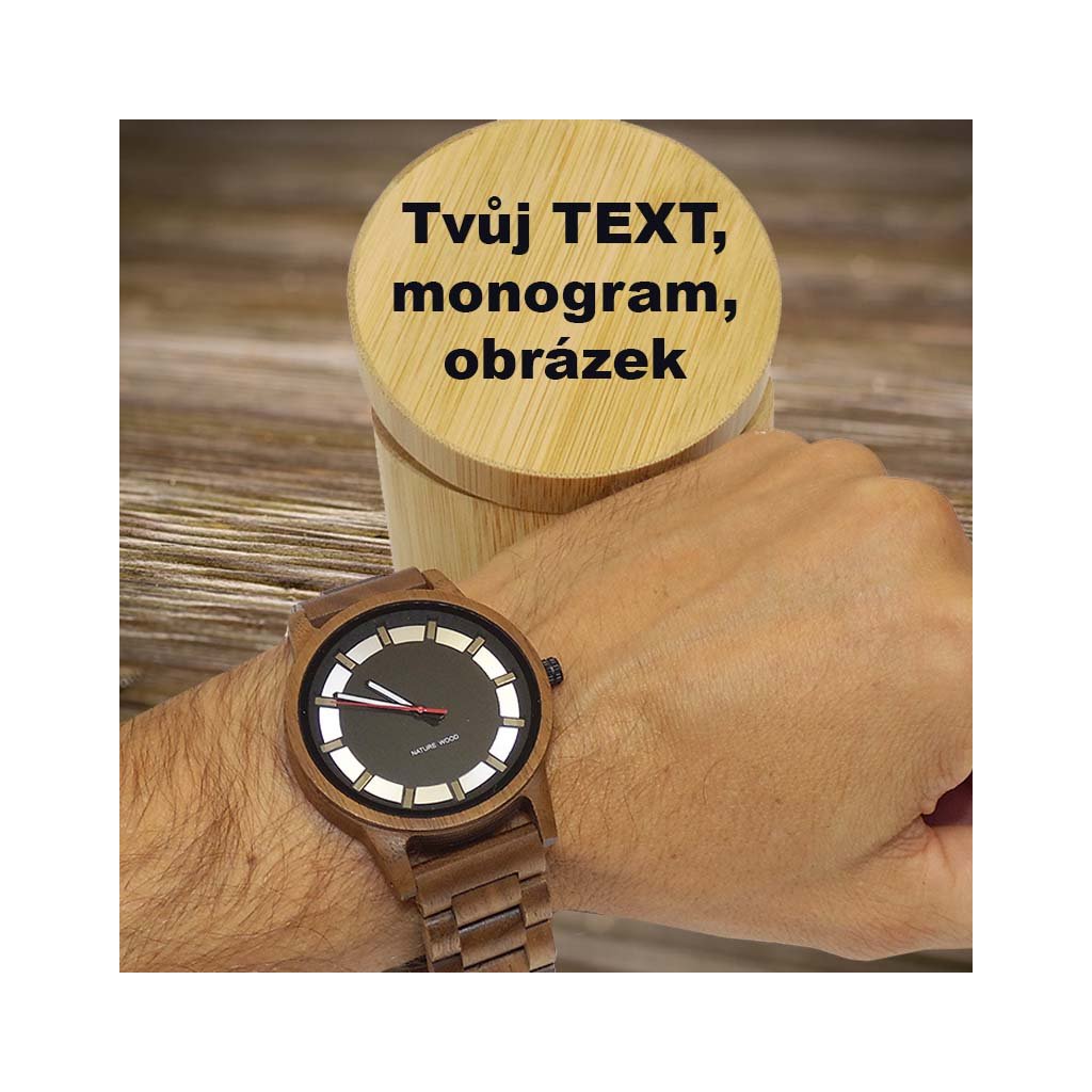 Dřevěné hodinky z bambusu s možností gravírování vlastního textu. Nastavitelný pásek, luxusní bambusová dárková krabička v ceně.