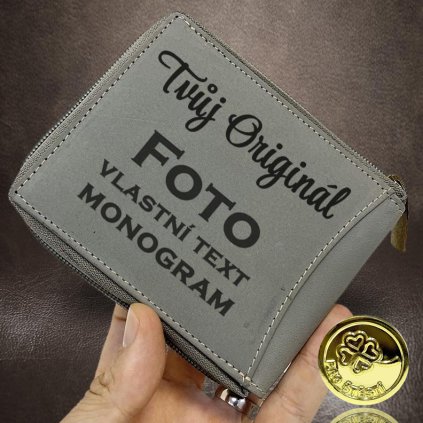 Peněženka z pravé kůže se stylovým šedým odstínem, celá na zip, ideální pro gravírování fotky, monogramu nebo textu. Skvělý dárek pro každého, kdo miluje kůži a originalitu.