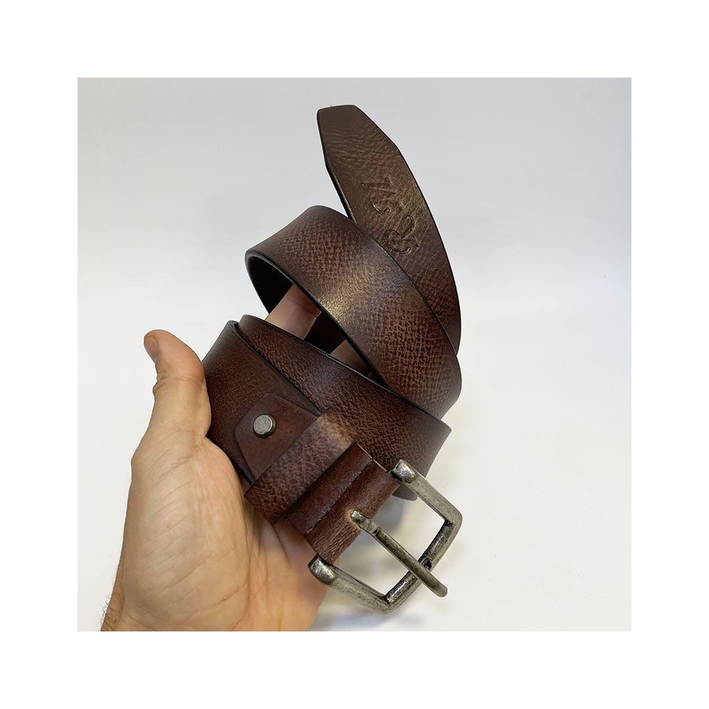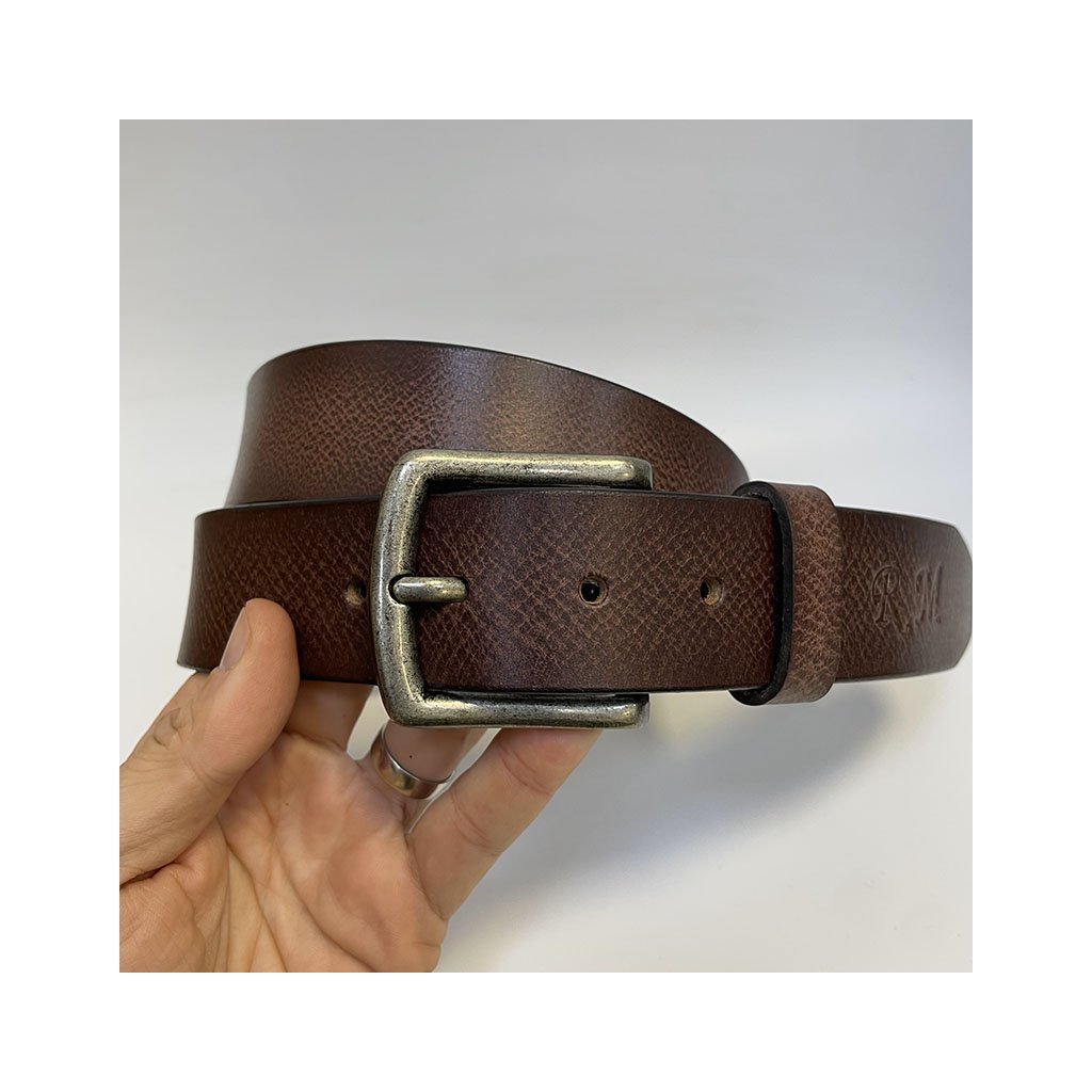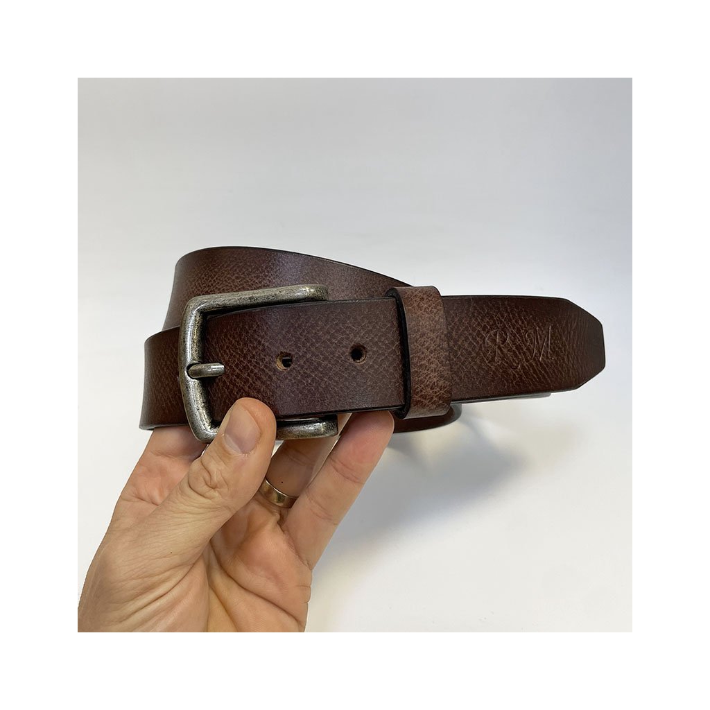Pánský hnědý kožený pásek – s přirozenou změnou odstínu a monogramem
