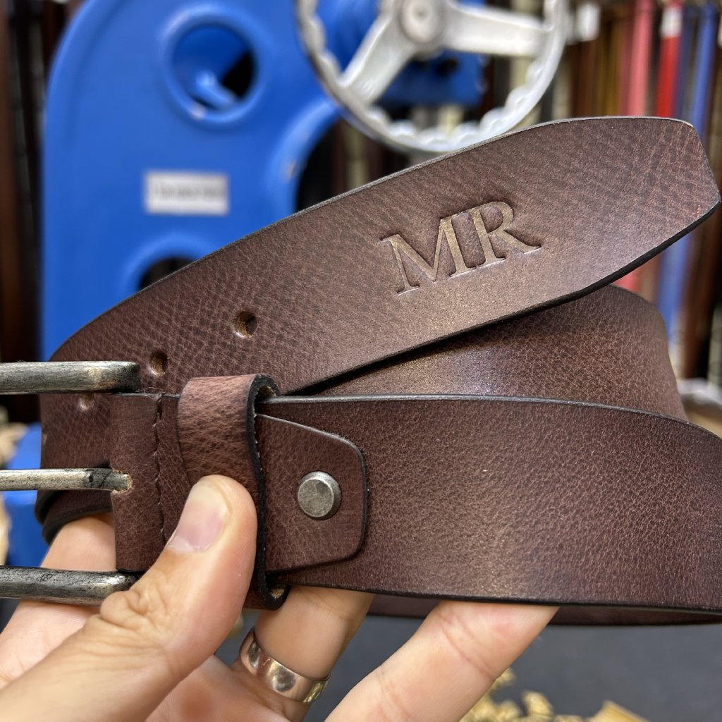 Kvalitní hnědý pásek z pravé kůže s ražbou monogramu – stylový a osobní doplněk pro každou příležitost.