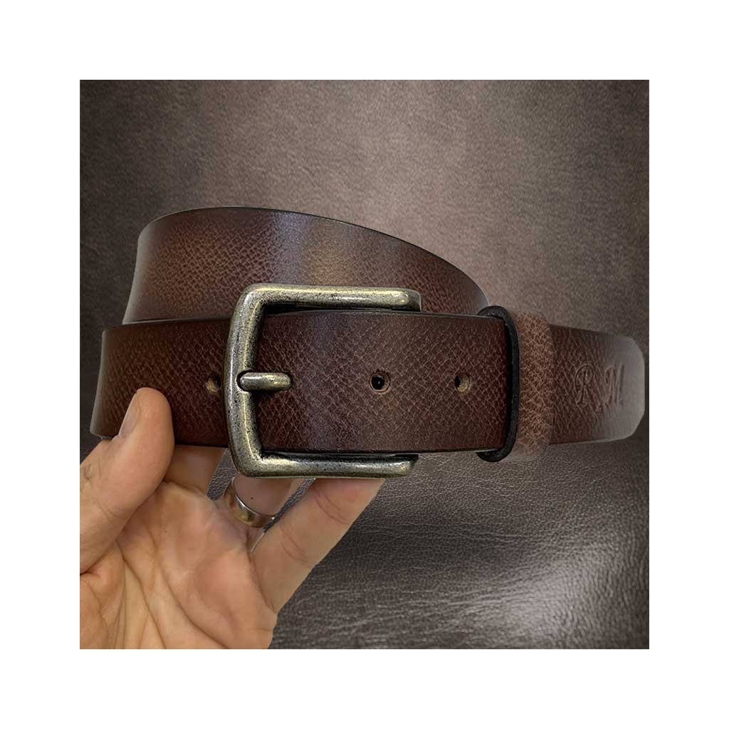 Tento elegantní pánský kožený pásek vyniká nádherným hnědým odstínem s přirozenými přechody barev, které se mění s každým pohybem a nošením. Jde o ručně zpracovaný produkt z pravé hovězí kůže, doplněný o ražbu vlastního monogramu a možnost gravírování textu, jména nebo loga. Dokonalý doplněk i luxusní dárek v jednom.