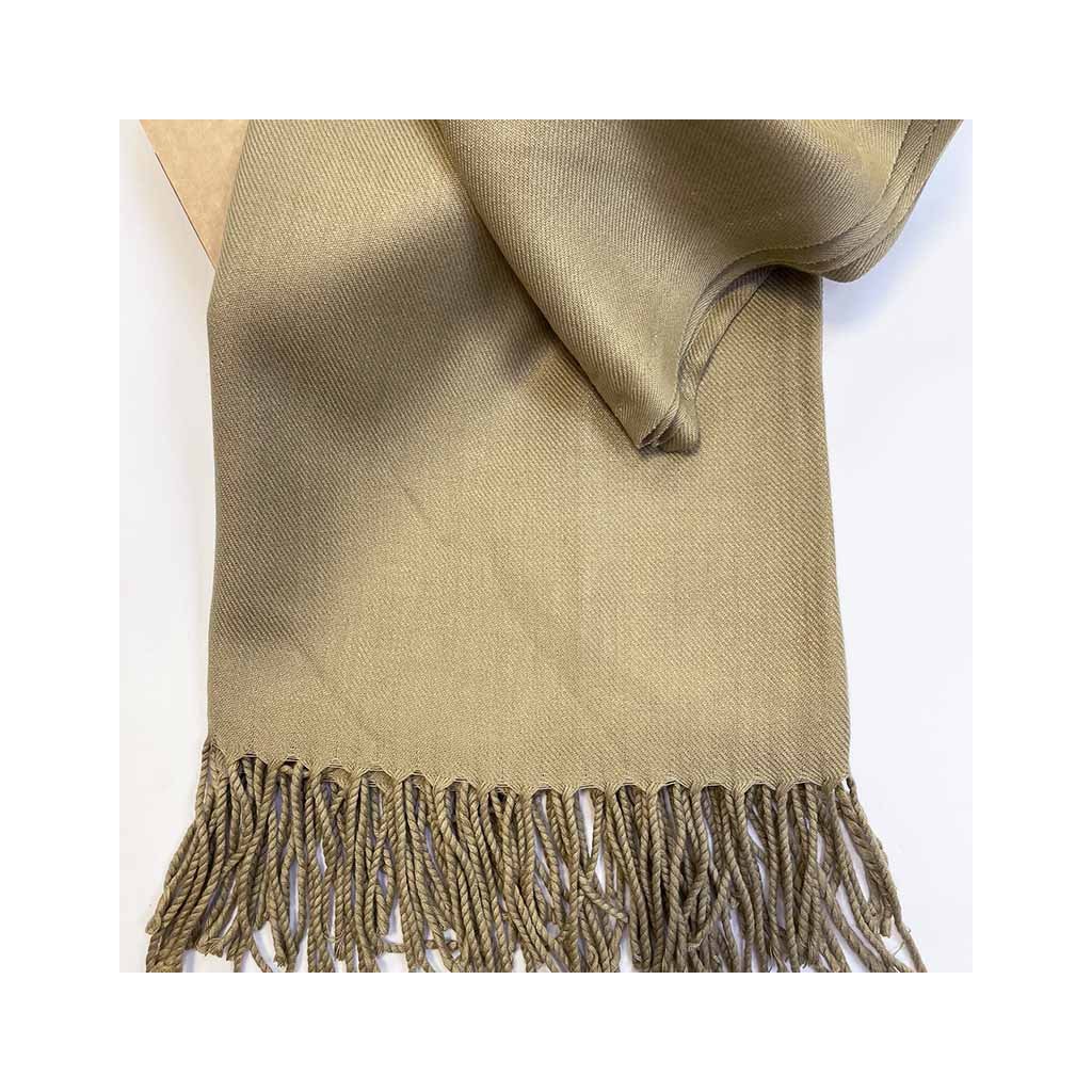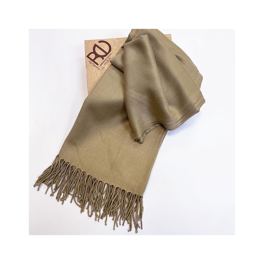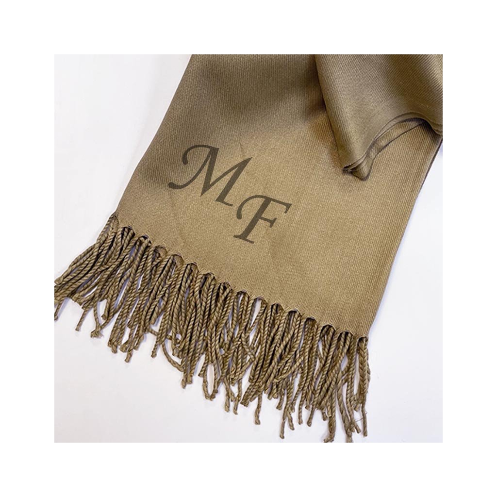 Hnědá dámská luxusní šála typu pašmína s elegantními třásněmi a možností vlastního monogramu. Stylový, hebký doplněk pro každé roční období.