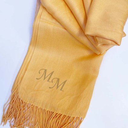 Luxusní světle oranžová pašmínová šála s vlastním monogramem. Elegantní doplněk s hebkým povrchem, třásněmi a možností personalizace – ideální dárek i stylový kousek do každého...