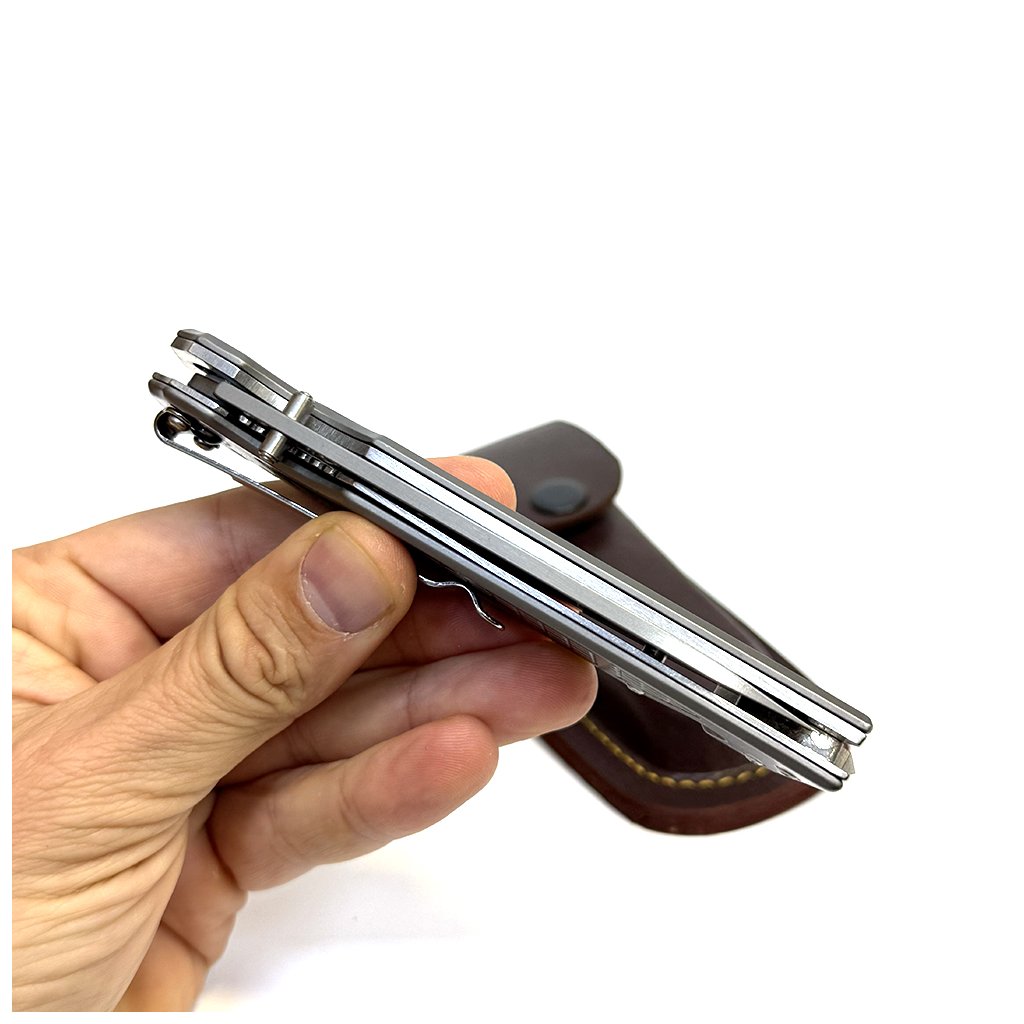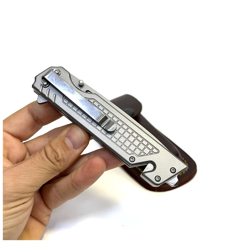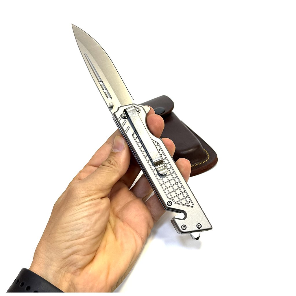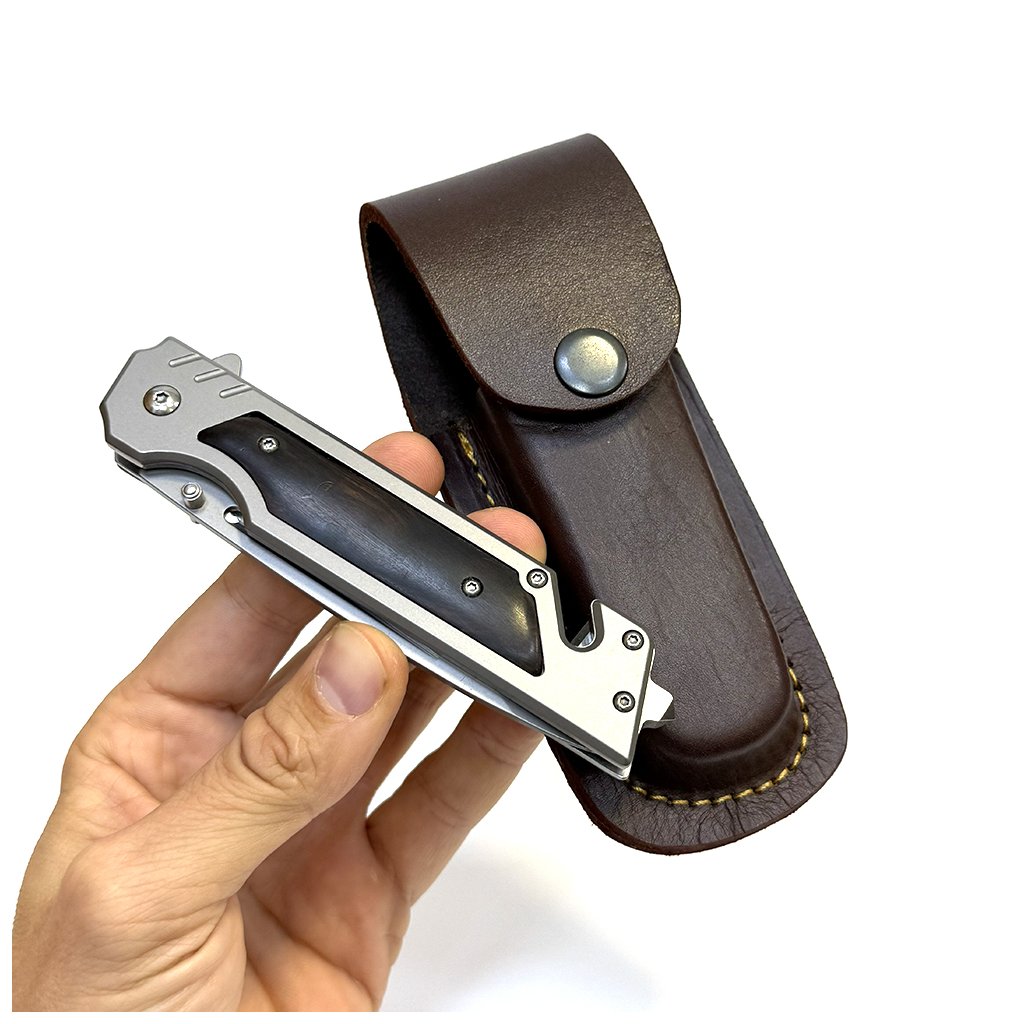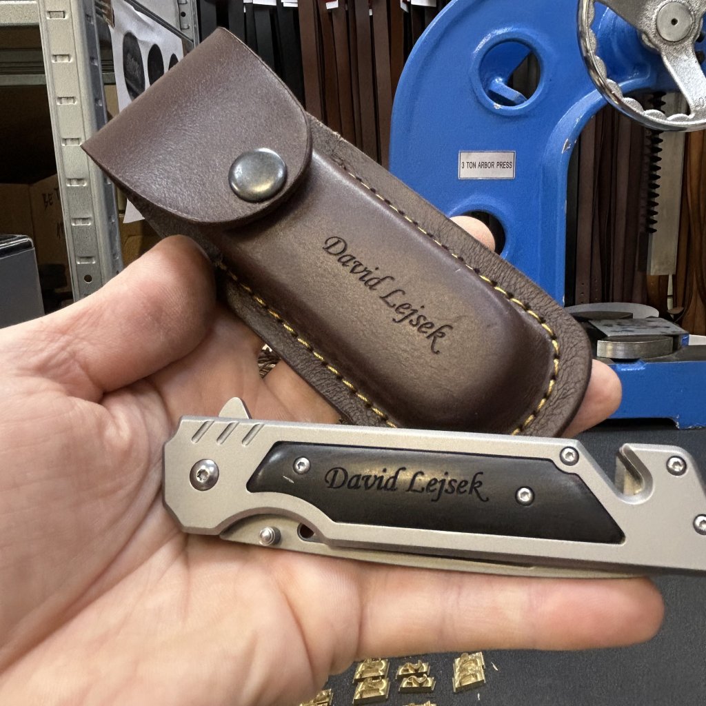 Kvalitní kovový vyklápěcí nůž s elegantním designem a koženým pouzdrem. Možnost originálního gravírování na pouzdro – text, motiv či monogram.