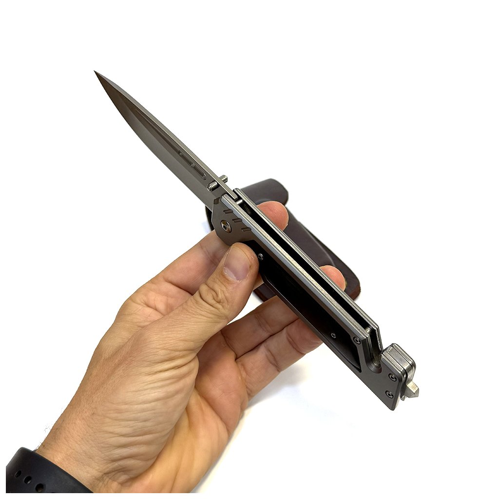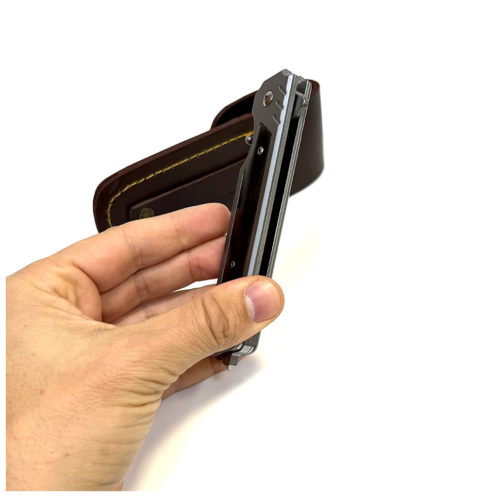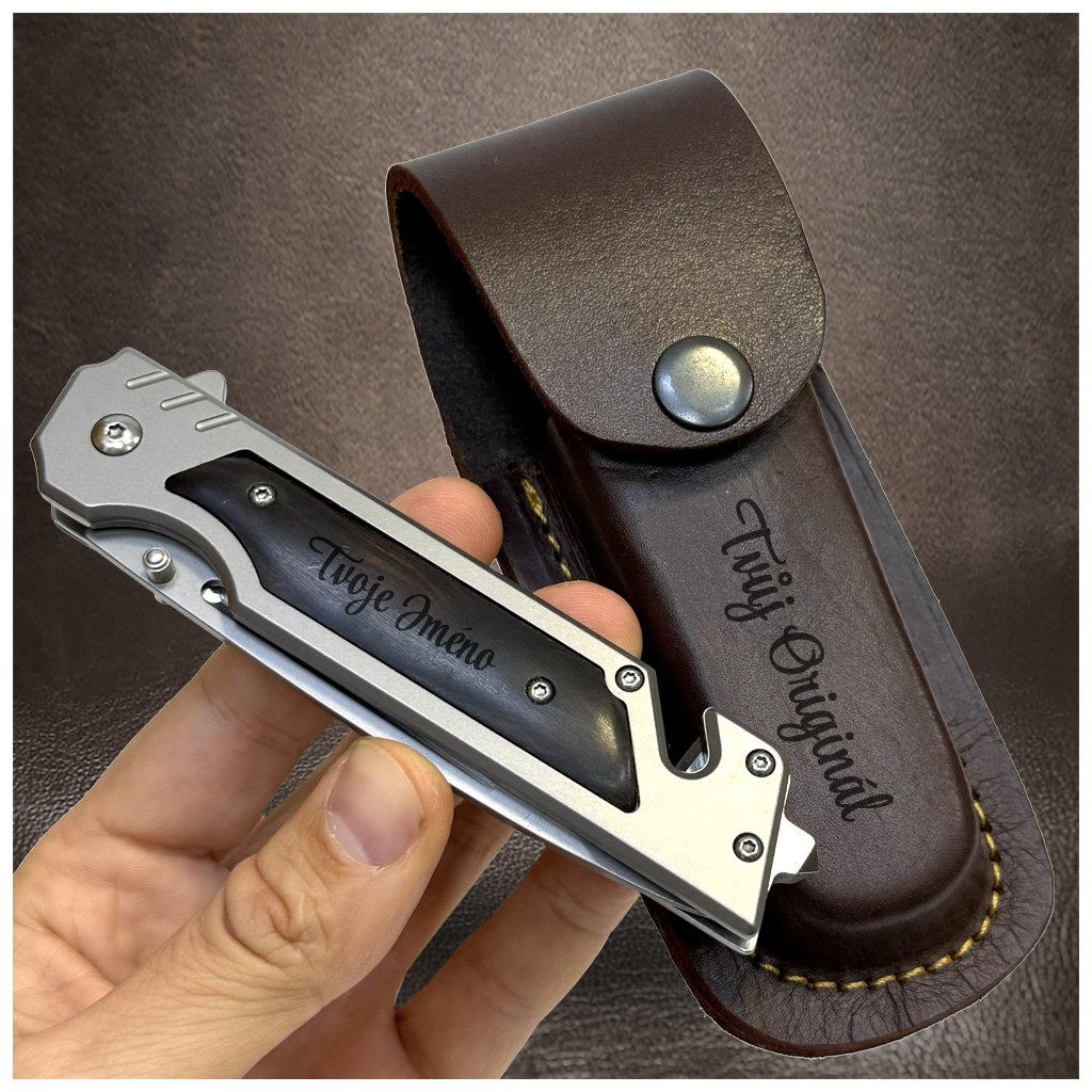 Moderní kovový vyklápěcí nůž s možností koženého pouzdra s vlastním textem + prémiové dárkové balení BE Original